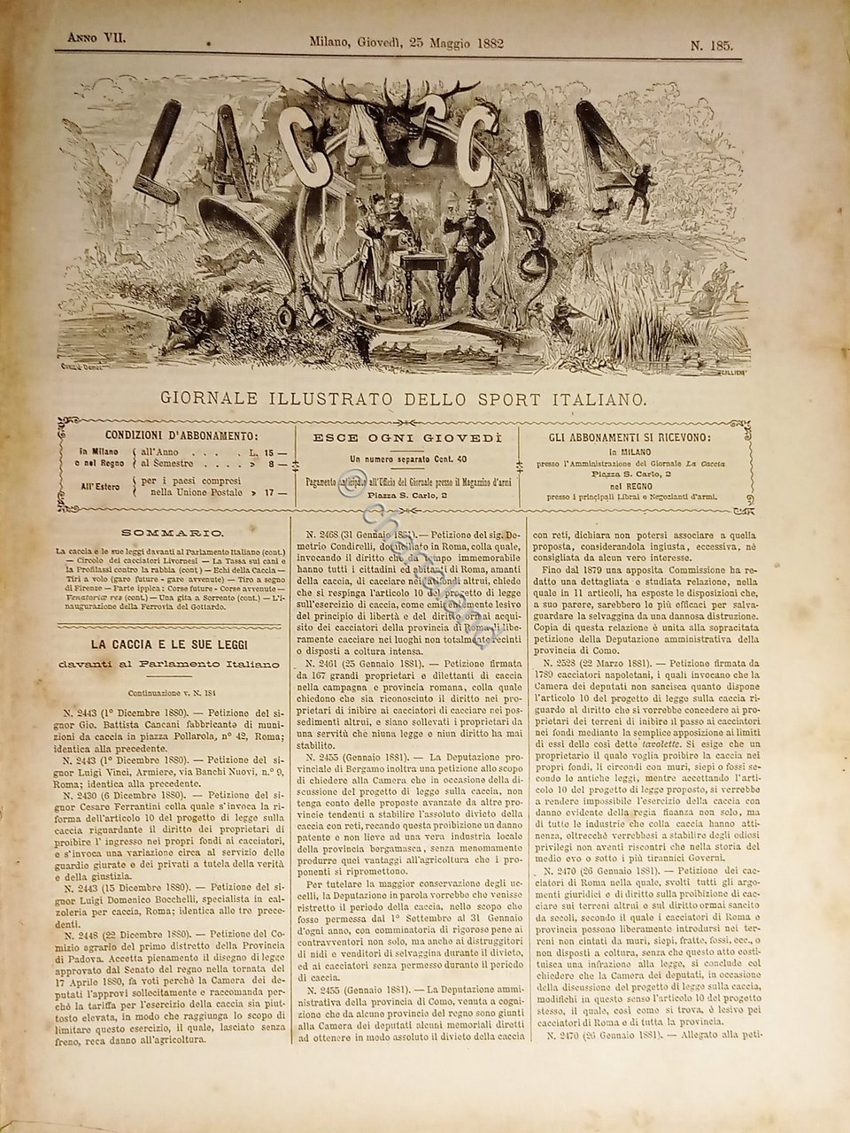Giornale Illustrato dello Sport Italiano - La Caccia N. 185 - 25 Maggio 1882