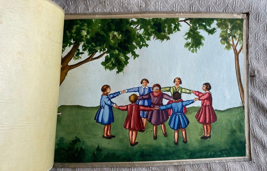 18 c. di tav. all'acquarello, 26x34 cm, cartoncino dell'epoca con titoli e cornice ms. a china, data timbrata e tre illustrazioni a motivo di gioco di ca. dei primi '900 applicate al piatto anteriore. Condizioni : USATO - Stato : Buono, ordinari segni d'uso e del tempo. Altre note : L'album contiene 18 acquarelli a piena pagina che illustrano 20 giochi, giocati nell'epoca fascista, con commento al verso di ciascuna tavola: Gioco alla palla e tamburello, all'osso di pesca, a ossi, a palline (partita a 24), pandolo-baston, saltavite, cerchio e aquilone, ai birilli, alla trottola e alla guerra, alla palla, girotondo, alla fune, alla settimana, altalena, rincorrersi, batti-spalla, mosca-cieca, bambola ammalata.