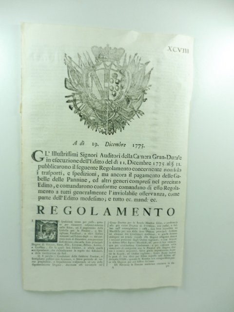 Gl'illustrissimi signori Auditori della Camera Gran-ducale in esecuzione dell'Editto del di' 11 Dicembre 1775 al 31 pubblicarono il seguente Regolamento concernente non solo i trasporti e spedizioni ma ancora il pagamento delle Gabelle delle Pannine.