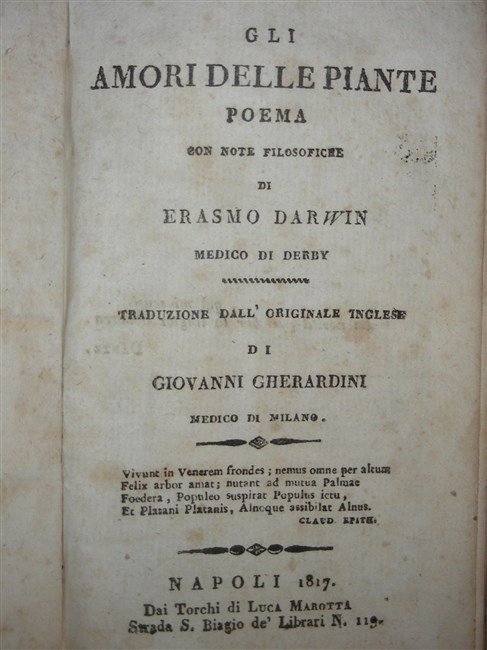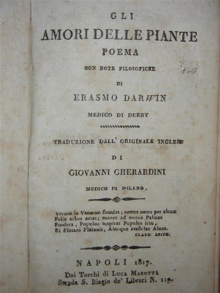 GLI AMORI DELLE PIANTE. Poema con note filosofiche di… Medico di Derby. Traduzione dall'originale inglese di Giovanni Gherardini medico in Milano.