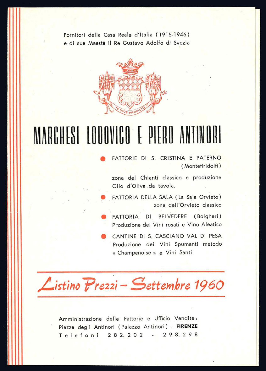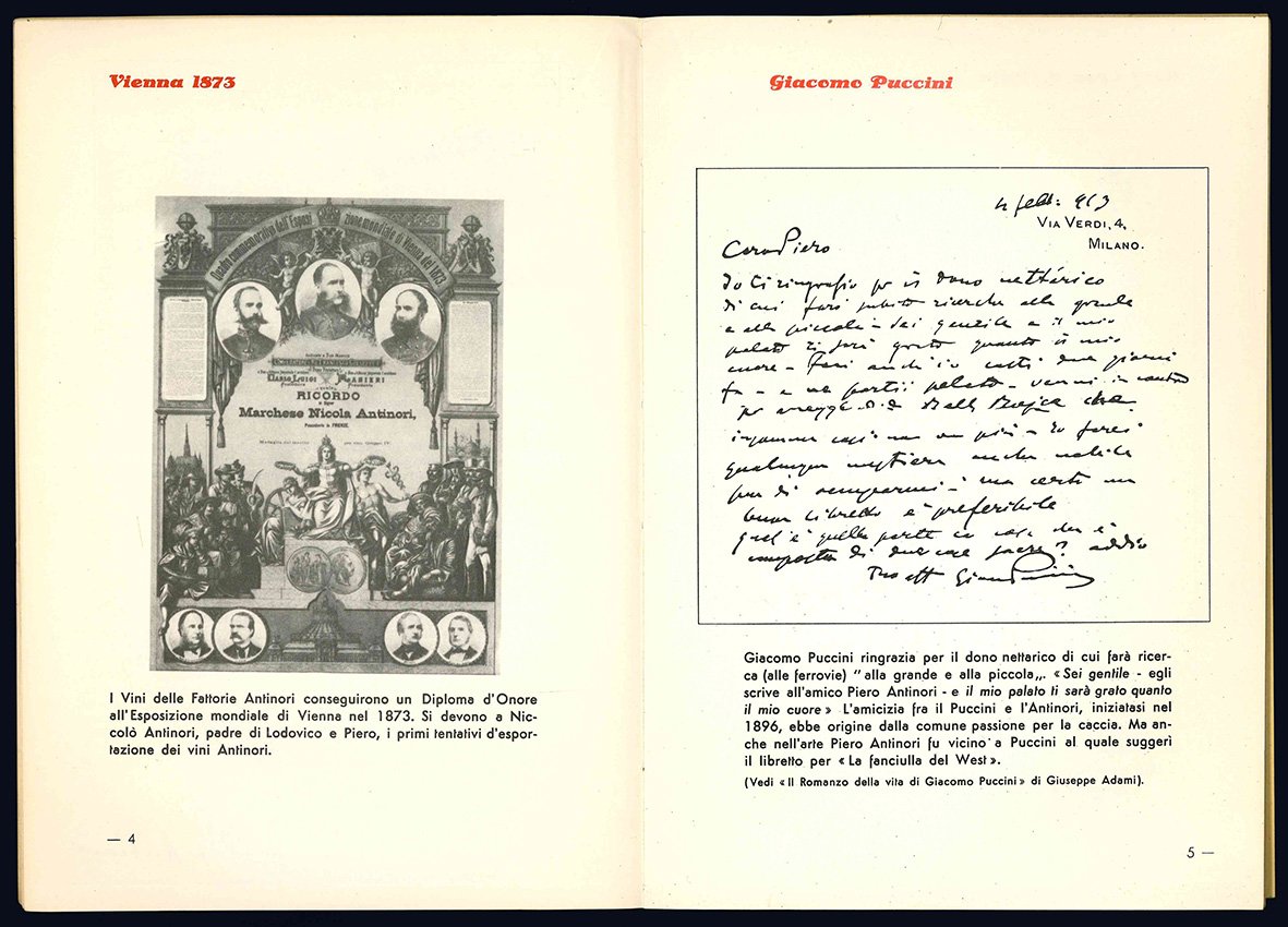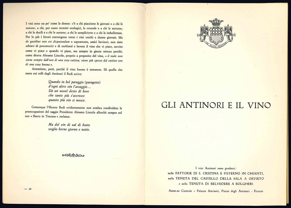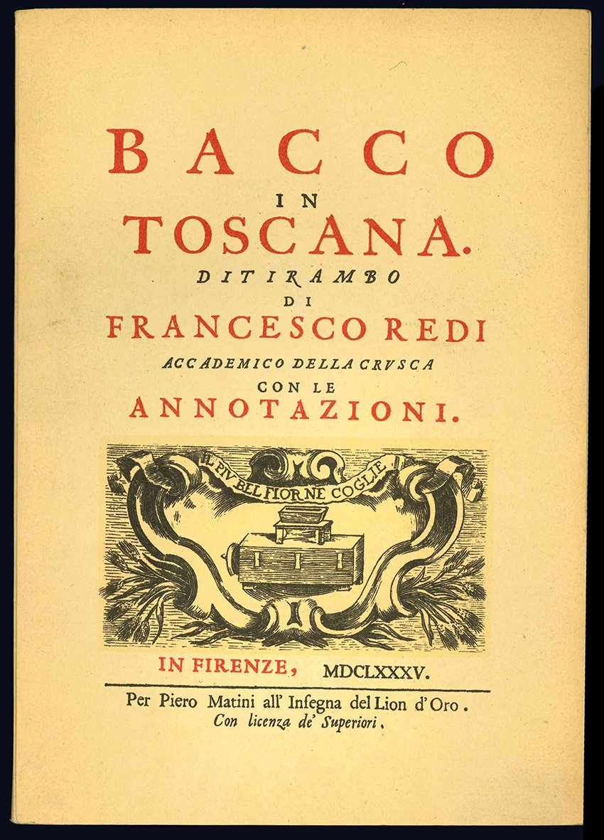 In 8vo (mm 235x165); pp. 32, con illustrazioni in bianco e nero nel testo. Testo stampato in rosso e in nero. Copertina editoriale raffigurante il frontespizio della prima edizione del "Bacco in Toscana" di Francesco Redi. Interessante opuscolo storico-celebrativo. Unito un listino prezzi dei vini.