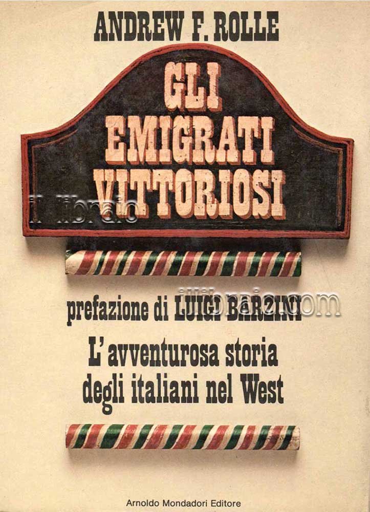 in 8°; pp. 422 + 8 tavv. (ill. in bn.); leg. con sovracop. L'avventurosa storia degli italiani nel West. Prefazione di L. Barzini