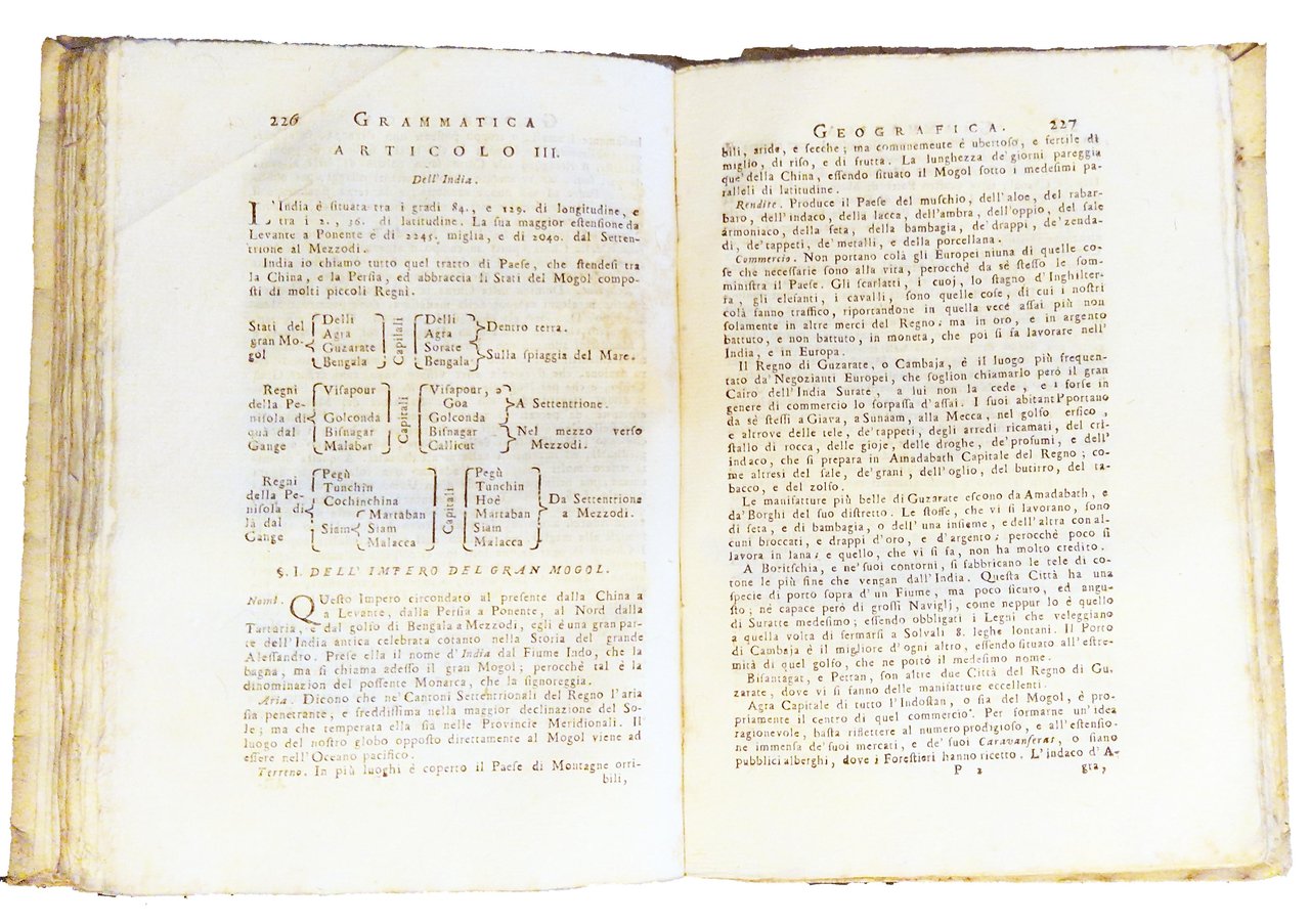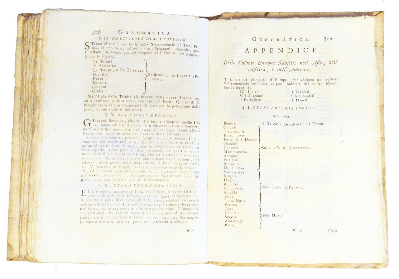 in-8°, 184x130 mm, leg. coeva in cartonato grezzo muto d'attesa, con titolo manoscritto al dorso; pp. VIII, 350, [2], [2] c. di tav. calcografiche. Fregio xil. sul frontespizio. Testatine, iniziali e fregi xil. Il testo è preceduto dalla prefazione dell'Autore inglese e da due tavole calcografiche fuori testo, più volte ripiegate, rffiguranti rispettivamente la Sfera armillare e il Globo terrestre. Seconda edizione di questo trattato geografico, tradotto da Patrick Gordon, diviso in due parti: nelle prima si considera il globo terrestre in generale, mentre la seconda parte contiene una descrizione particolare del globo medesimo. in fondo al testo è presente un'appendice "delle colonie Europee stabilite nell'Asia, nell'Africa, e nell'America" e una Tavola alfabetica delle Città principali d'Europa, con le loro longitudini e latitudini. Quest'opera fu successivamente pubblicata numersose volte, ma con il titolo "Grammatica geografica, …" [cioè con la doppia M). Rif.: IT\ICCU\CFIE\009991. OCLC, 797441849. Cond.: Tracce d'uso alla legatura (lievi macchie ai piatti, piccola spaccatura di un paio di centimetri lungo la cerniera anteriore ). Carte pulite, in barbe, con rarissimo foxing. Testo marginoso. Esemplare molto buono.