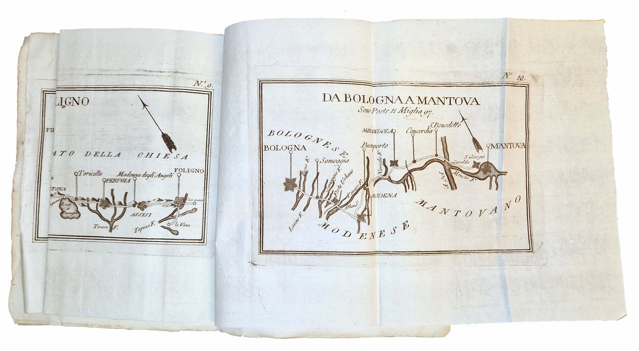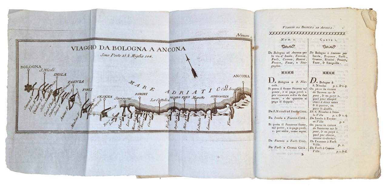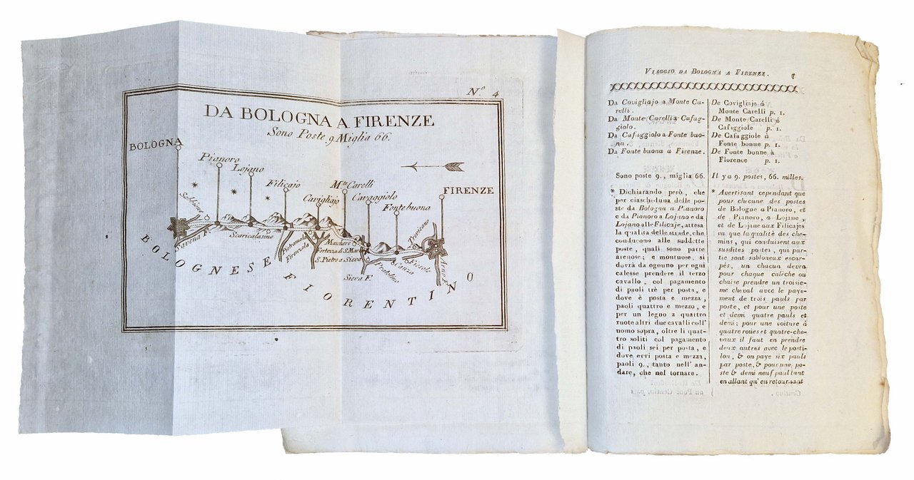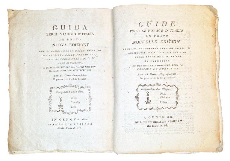 in-8°, 216x152 mm, leg. coeva in brossura muta; pp. VIII, 71, [1], 25 c. di tav. geogr. calcogr. ripiegate. Front. e testo in italiano e francese. Bella e rara edizione di questa guida geografica (precedentemente pubblicata a Torino nel 1776 e a Genova nel 1786). L'opera offre un dettagliato resoconto dei tragitti percorribili in carrozza nel Regno di Sardegna e nei principali stati italiani, con indicazioni sulle distanze, il numero di poste, la qualità delle strade e i costi per il trasporto a cavalli, specificando anche le tratte più impervie. Indicazioni chilometriche e tariffarie in miglia italiane e francesi. Rif.: IT\ICCU\LO1E\041174. OCLC, 45583312. Cond.: Segni d'uso alla legatura (abrasioni e mancanze alle carte dei piatti e del dorso, lentezza della legatura). Carte pulite, marginose e in barbe. Esemplare genuino e molto buono.