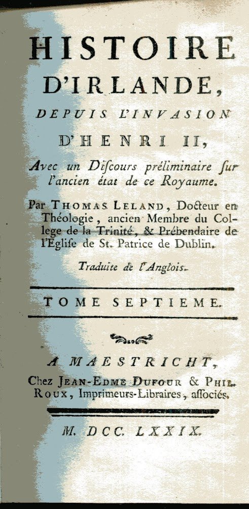 Histoire d'Irlande, depuis l'invasion d'Henri II, avec un Discours préliminaire sur l'ancien état de ce Royaume. Par Thomas Leland, Docteur en Theologie, ancine Membre du College de la Trinité, . Traduit de l'Anglois. Tome I - VII