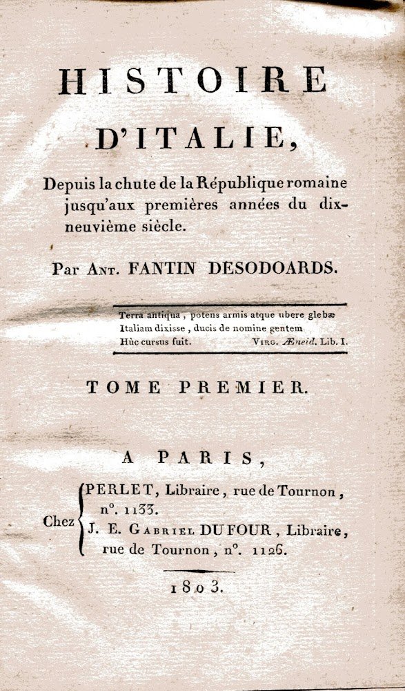 Histoire d'Italie, depuis la chute de la Republique romaine jusqu'aux premières années du dixneuvième siècle. Par Ant. Fantin Desodoards ... Tome premier -neuvième