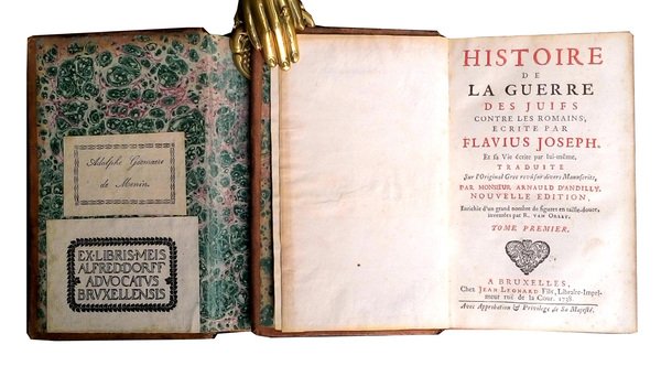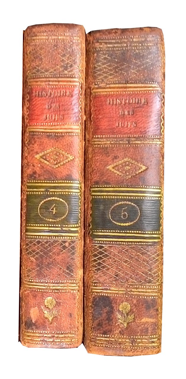 in-8° (154x100 mm); stessa legatura dell'opera [1.], con la quale costituisce un set completo di opere del Flavio, se pur di diverse edizioni (i volumi di quest'opera sono indicati ai dorsi con i numeri 4 e 5); 2 vol.; pp. LXXXIV, (8), 358, (17), (1 b.); 555, (38), (1 b.); numerosissime incisioni nel testo ( cm 6 x 7,5) raffiguranti assedi, rese e conquiste di città, scene di vita, esecuzioni capitali, martirii, battaglie di fanti e di cavalieri; bellissime xilografie alle testate, ai capilettera ed ai finali. Opera molto interessante e rara (quest'edizione del Leonard non risulta censita dal Catalogo Unificato delle biblioteche italiane). L'opera è una preziosa traduzione, a cura dello scrittore e traduttore francese Robert Arnauld d'Andilly (28 maggio 1589 - 27 settembre 1674), del famoso testo "Guerre giudaiche" del 66-70 a.C., opera dello storico giudeo romanizzato Giuseppe Flavio (ebraico: Joseph ben Matthias; latino: Josephus Flavius; Gerusalemme, 37 circa - Roma, 100 circa), scritta in greco nel 75 circa; essa comprende l'avviso ai lettori (Avertissement) del traduttore, quindi l'approvazione (Approbation), fatta a Parigi il 19 giugno 1668, con Imprimatur a Bruxelles il 16 gennaio 1675, e l'estratto dei privilegi, sempre a Bruxelles il 27 ottobre 1694; a seguire, la vita dell'Autore, scritta da se stesso e la prefazione sempre dell'Autore; dopo il testo, in fondo a ciascun volume, dopo il testo è riportata la tavola dei capitoli (indice); inoltre, in fondo al secondo ed ultimo vol., dopo la tavola dei capitoli, c'è la tavola delle materie dei due volumi. Prov.: Indicazioni d'appartenenza, a due diverse persone, su etichette al contropiatto anteriore (una riportante la scritta "Adolphe Goemaere de Menin" e l'altra "ex libris meis Alfred Dorff advocatus bruxellensis"); quest'ultima appartenenza è indicata con timbro a inchiostro blu riportante l'indirizzo (Alfred Dorff Avenue de la Toison d'or 67 Bruxelles). Rif.: Edizione non censita da ICCU, che riporta invece l'edizione del Fricx del 1703 (IT\ICCU\CFIE\028419). OCLC, 5430212. Cond.: L'opera è completa, quasi in ottime condizioni generali, fatti salvi alcuni segni d'usura alla legatura in pelle. -- 2 vol. in-12, pleine basane brune, dos lisses ornés de filets, roulettes et fleurons dorés, pièces de titre en maroquin rouge et vert, lég. différence de teinte des dos, mais décor identique, 2 ex-libris aux contreplats + ex-libris mss. et cachet ex-libris des mêmes propriétaires, mors et coiffes frot., coins usés (rel. de la fin du 18e s). -- AN IMPORTANT HISTORICAL WORK ON JEWS IN A BEAUTIFUL SET. Complete set, quite in perfect condition, except for some traces of wear to the leather binding.