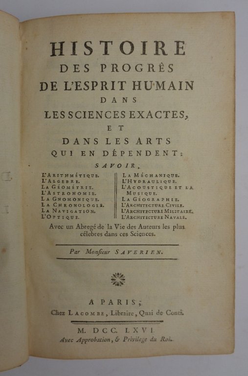 HISTOIRE DES PROGRES DE L'ESPRIT HUMAIN DANS LES SCIENCES EXACTES ET DANS LES ARTS QUI EN DEPENDENT. Savoir: L'Arithmétique, L'Algèbre, La Géométrie, L'Astronomie, La Gnomonique, La Navigation, L'Optique, La Méchanique, L'Hydraulique, L'Accoustique et la Musique, La Géographie, L'Architecture Civile, Militaire et Navale. Avec un Abrégé de la Vie des plus célèbres Auteurs dans ces Sciences.