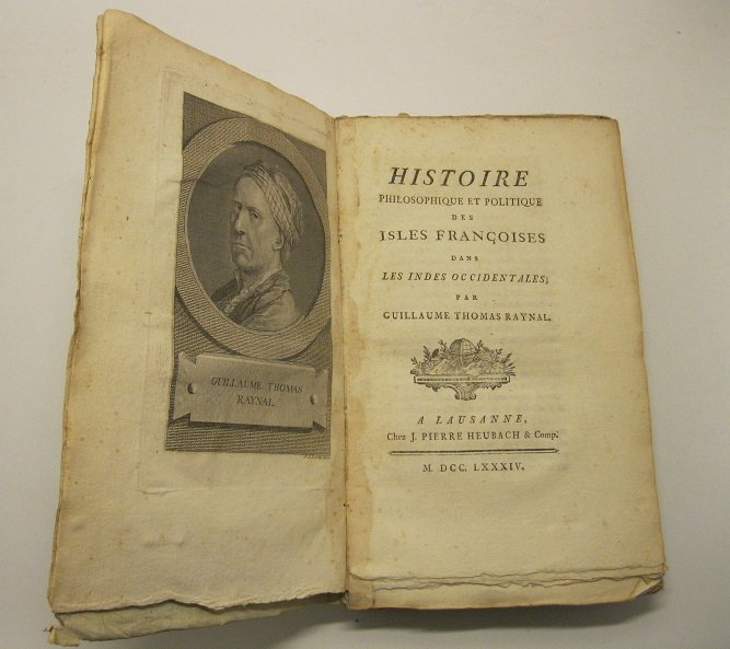 In 8, pp. XIV + 356 con 1 ritr. inc. all'antip. e 1 grande tabella piu' volte rip. Br. ed. muta. Ottimo es. genuino in barbe e intonso. Edizione originale di quest'opera che partendo dalla sua piu' famosa dedicata ai commerci europei nelle indie e nelle americhe, si occupa specificatamente della colonizzazione della Francia nelle americhe. Dopo aver analizzato il ritardo francese nella corsa coloniale, Raynal descrive i tentativi fatti verso le Antille a partire dagli inizi del XVII sec. Tratta poi della conquista della Guyana, di Santa Lucia, della Martinica, di Guadalupe, di Santo Domingo e di Tabago. Raynal dopo un inizio ecclesiastico, abbandonato il sacerdozio si fa conoscere come apostolo della liberta'. Il ritratto sulla terza edizione della sua importante opera sul commercio degli europei nelle Indie, opera avversata e conndatta al rogo, lo obbliga a fuggire, prima in Svizzera poi in Prussia, tornato in Francia nel 1784, si dedica a istituire premi accademici. Con la rivoluzione si mettera' nei guai con molte critiche agli eccessi del terrore. La sua fama gli evitera' la ghigliottina.
