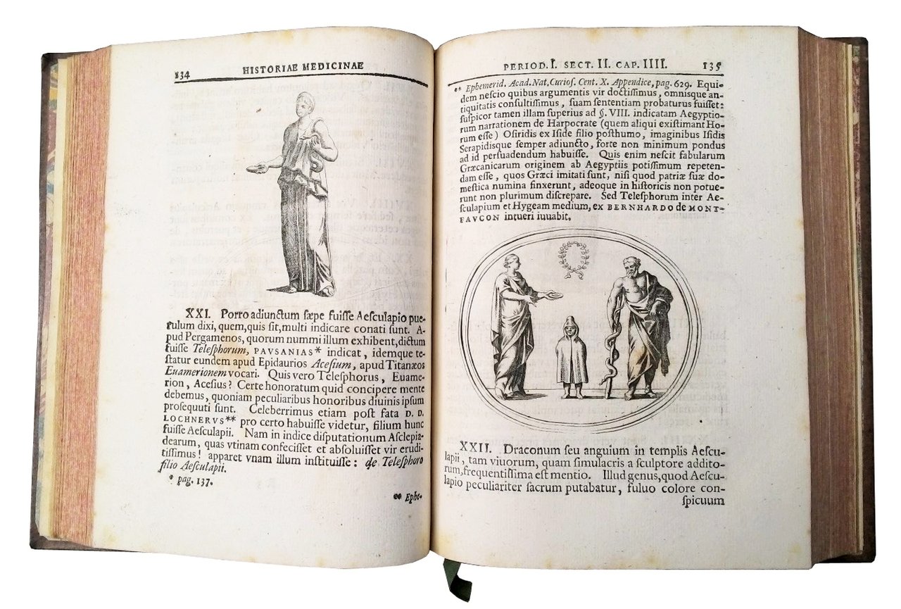 in-4° (210x156 mm); leg. in pelle marrone coeva, dorso a cinque nervi con decori dorati, titolo a caratteri dorati su tassello in pelle rossa, guardie in carta marmorizzata, tagli colorati di rosso a spruzzo, nastrino segna pagine (leggeri segni d'uso alle cerniere); pp. (24), 437, (34), (1 b.); ill. calcografica in testata alla dedica, con ritratto del dedicatario, Federico Augusto I (inciso da Georg Daniel Heumann), frontalini calcografici, iniziali, finalini e fregi xilografici, incisioni calcografiche nel testo ed una su pagina intera; testo preceduto da dedica, prefazione e tavola cronologica della storia della medicina. Rara prima edizione di questa interessante ed importante opera di storia della medicina, a cura del Dr. Schulze, pubblicata da Peter Conrad Monath (1713-1747). Johann Heinrich Schulze (1687-1744), medico e professore ad Halle, esperto anche in letteratura greca ed araba. Prov.: Indicazione d'appartenenza su bella etichetta con incisione calcografica, incollata al contropiatto ant. ("ex libris D. Morand Acad. Paris. Londin. Bonon."). Rif.: IT\ICCU\MILE\023272 (3 copie). OCLC, 4767161. Cond.: Presenza di leggeri arrossamenti e foxing; opera in condizioni generali molto buone. -- A RARE FIRST EDITION OF A WORK BY DR. SCHULZE ON THE HISTORY OF MEDICINE. Cont. calf, gilt orn. spine on 5 raised bands (joints sl. rubbed), gilt red title label, (somewhat spotting inside). Good copy.1st ed. of this book on the history of medicine by J.H. Schulze (1687-1744), physician and medical prof. at Halle. He was also skilled in Greek and in Arabic literature. Engr. ills. Occasional light redness and foxing; work in very good condition.