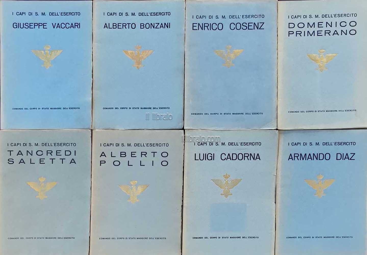 8 voll.; in 8°; pp. 28, 22, 24, 20, 24, 24, 32, 32 (ill. a col.); br.; coll. I capi di S. M. dell'esercito A cura del Comando del Corpo di Stato Maggiore. Tutta la collana COMPLETA. Monografie dedicate ai comandanti dell'Esercito italiano, dalla sua fondazione a dopo la prima guerra mondiale.