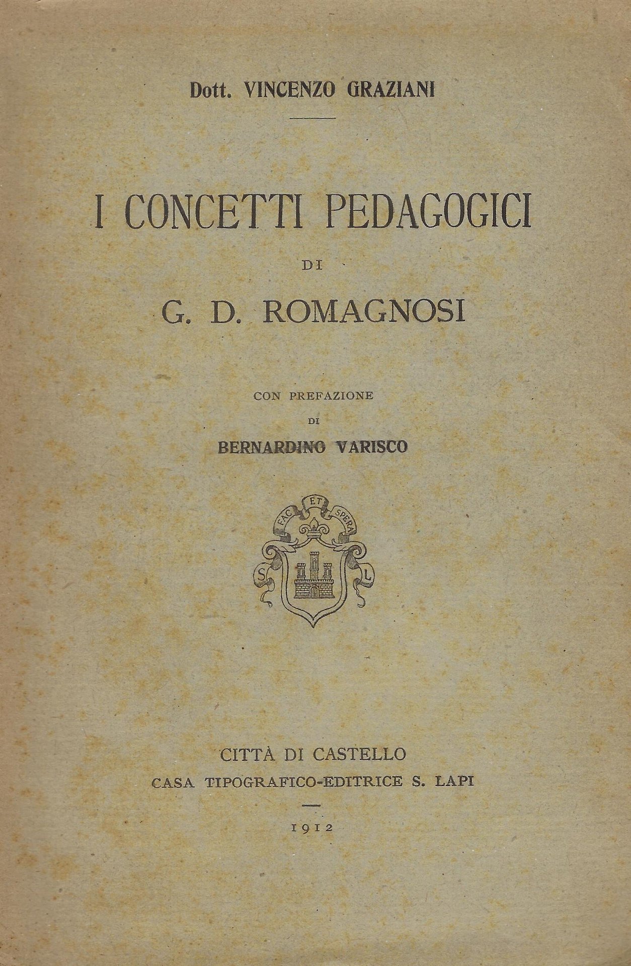S. Lapi, 1912. Con prefazione di Bernardino Varisco, 136 pp. brossura Ottimo (Fine) lievi fioriture sulle pagine e sulla copertina, dedica a penna su sguardia anteriore.