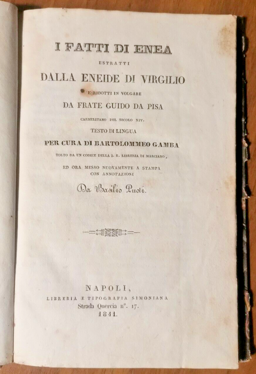 I FATTI DI ENEA ESTRATTI DALL'ENEIDE DI VIRGILIO Guido da Pisa 1841 Napoli Libro