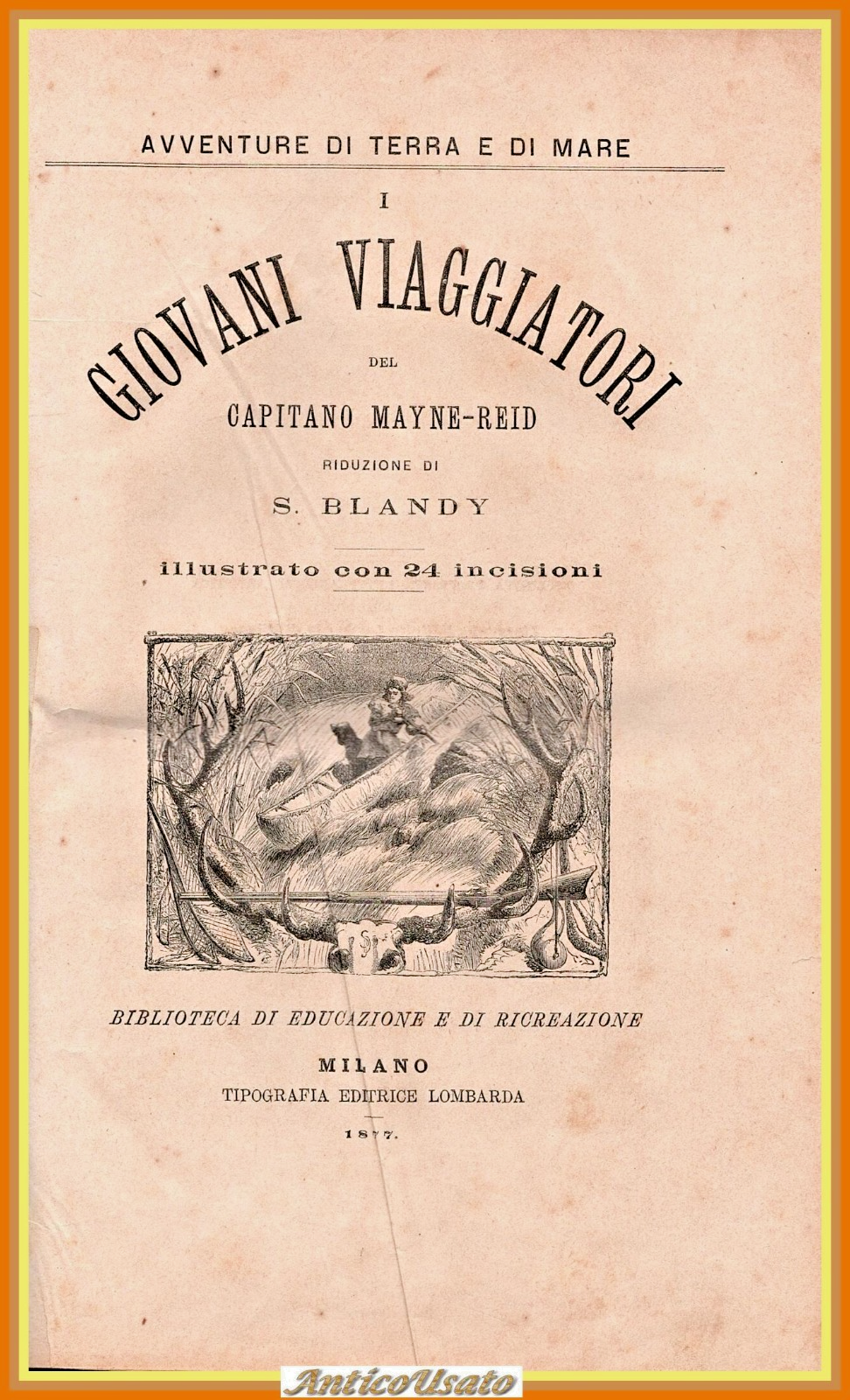5 romanzi del Capitano Mayne Reid. I GIOVANI VIAGGIATORI, IN MARE, I GIOVANI SCHIAVI, I CACCIATORI DI GIRAFFE, GLI ESILIATI NELLA FORESTA Milano, tipografia editrice Lombarda, 1874 - 1877. 164 + 160 + 168 + 123 + 140 pagine, oltre 100 incisioni in bianco e nero nel testo. Copertina non editoriale in mezza pelle. Stato di conservazione: molto buono (pagine normalmente ingiallite, manca il frontespizio del secondo volume, piccole spellature alla copertina) Libro usato saggistica