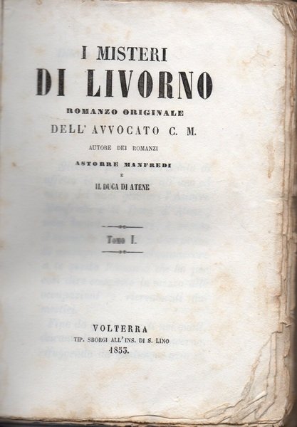 2 Tomi In-16° in 1 Vol., legatura rifatta in mezza tela rossa con tit. e filetti in oro al dorso, pp. 308(4) e 244(4). Prima edizione (le seguenti aggiungeranno il titolo 'I Demagoghi') di questo romanzo di Monteverde, avvocato e scrittore, autore di romanzi storici di un certo successo (Asstorre Manfredi; Il Duca di Atene; La vittoria di Castelfidardo e la presa d'Ancona ossia Gli ultimi sforzi della tirannide clericale). Buono stato di conservazione.