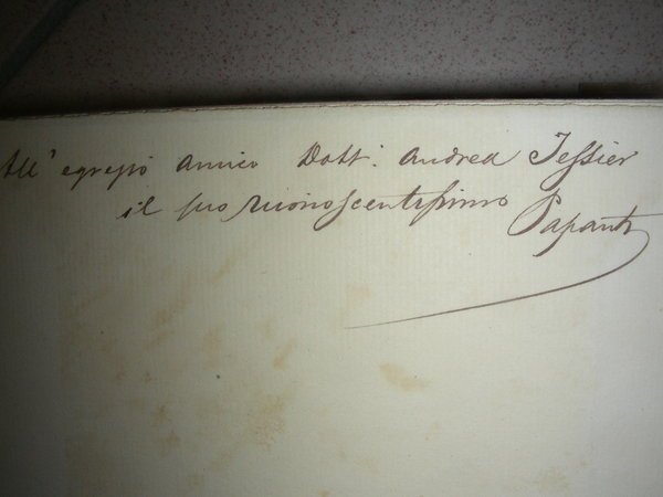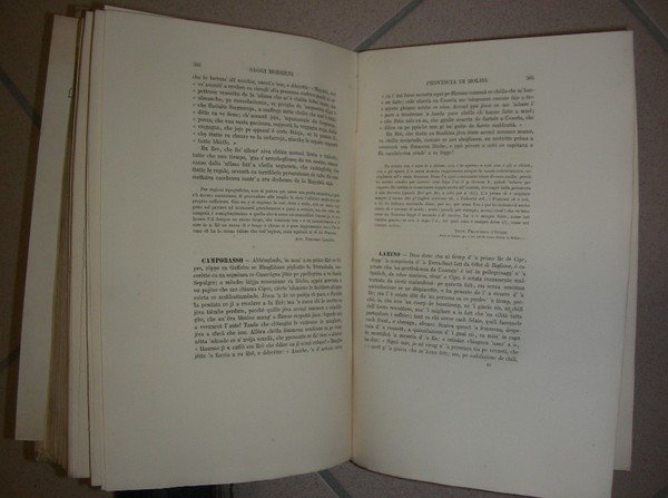 gr. vol. in-8, pp. XIV, 736, leg. cartone rigido edit. Con una tav. rip. e ritr. del B. in vignetta al front. Bellissima e interessante pubblicazione di una novella del B. tradotta in vernacolo di città e paesi italiani (più di 700 versioni). Ogni traduzione è firmata. Manca a Parenti. Raro. Con invio autogr. dell’A. sulla prima carta bianca. Picc. tracce d’uso alle cuffie ma ottimo esempl. parzialmente intonso. [093]