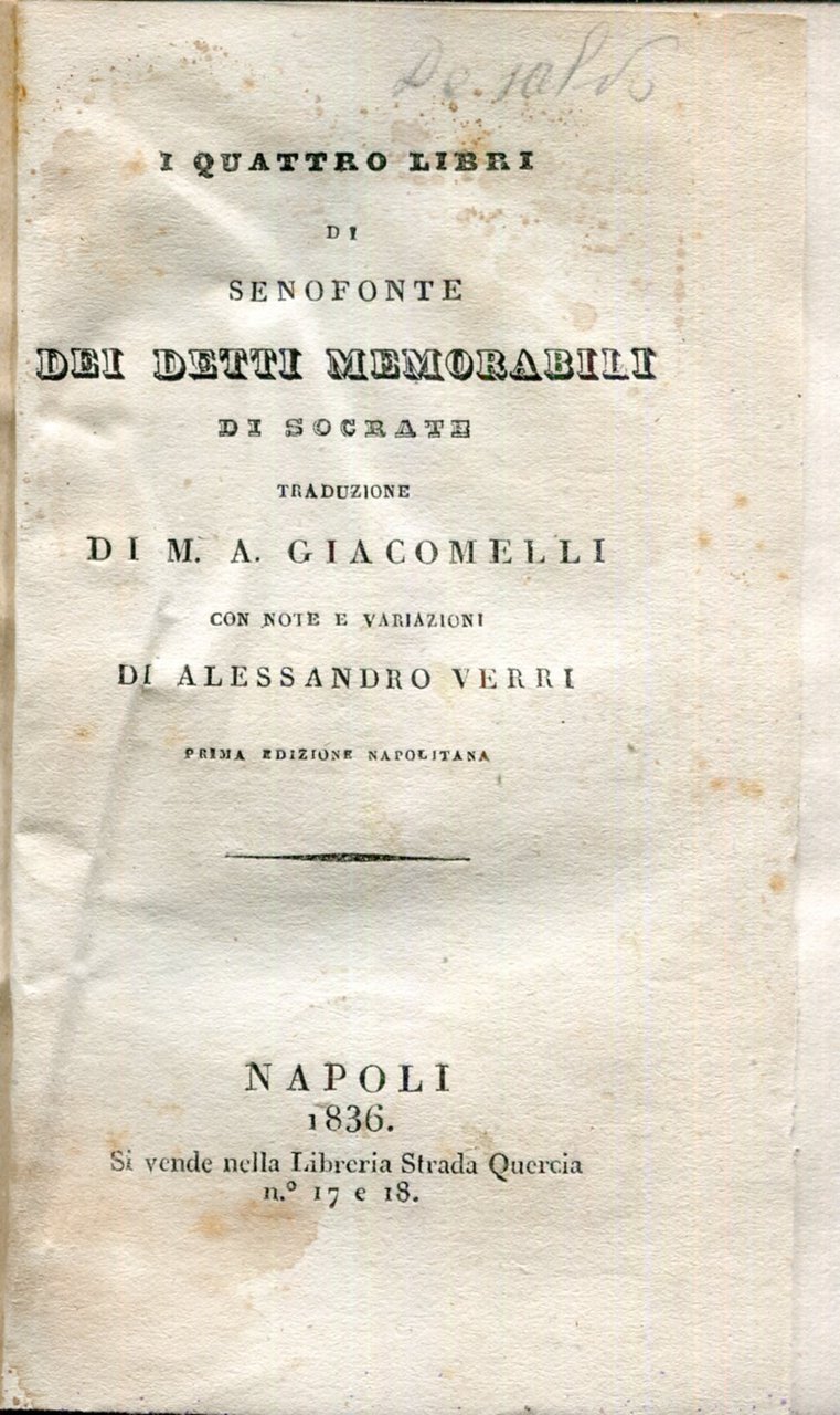 I quattro libri di Senofonte dei detti memorabili di Socrate. Traduzione di M. A. Giacomelli con note e variazioni di Alessandro Verri. Prima edizione napolitana