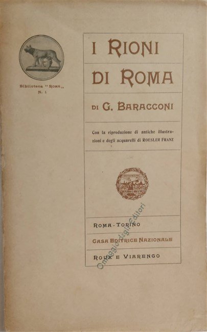 gr. vol. in-8, pp. 606, bross. edit. Con numerose ill. n.t. Con la riproduzione di antiche illustrazioni e degli acquerelli di Roesler Franz. Le vicende storiche ed edilizie dei rioni romani “come in rapidi schizzi pittorici”, opera in cui l’A. esprime il rammarico del continuo rinnovamento della città. Lo studio è suddiviso per zone: Monti, Campo Marzo, Fonte, Parione, Ripa, Pigna, etc. Bell'esempl. nella bross. edit. [218]