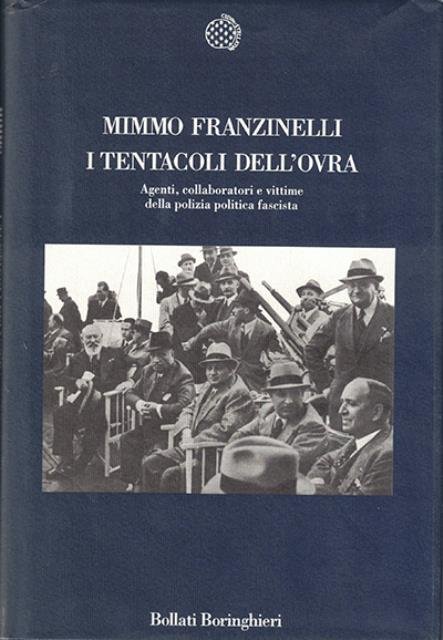 XIX, 745 p. ; 22 x 15 cm + 1 opusc. 19 p. (L'elenco dei confidenti della polizia politica fascista / a cura di M. Franzinelli, Torino, Bollati Boringhieri, 2003). Nuova cultura, 69. Sigla di «Opera Volontaria di Repressione Antifascista», «Organizzazione di Vigilanza e Repressione dell’Antifascismo», «Organo di Vigilanza dei Reati Antistatali», o forse più probabilmente frutto dell’associazione nella fertile mente del duce con piovra o con Ochrana (la polizia segreta zarista), il termine «Ovra» continua a esercitare un fascino sinistro. Ma all’interesse scandalistico non avevano corrisposto studi adeguati. Basato sull’analisi dei fondi versati all’Archivio centrale dello Stato dal ministero dell’Interno, opportunamente verificati con quante più fonti possibili, il libro di Franzinelli – con allegato l'elenco dei confidenti della polizia politica fascista (ISBN 8833914224) – è uno studio profondamente innovativo per almeno due aspetti. In primo luogo la considerazione dei margini di autonomia che mantenne la polizia politica ereditata dall’epoca liberale, per cui la storia dell’apparato e le vicende dei funzionari non si identificano e non si esauriscono col fascismo. Il centro della ricerca poi è costituito dall’analisi degli informatori della polizia politica, reclutati specialmente nei movimenti di sinistra, con storie individuali in cui gli itinerari esistenziali e i percorsi ideologici risultano stravolti dall’impatto col sistema investigativo repressivo. Ancora oggi I tentacoli dell’Ovra rimane il più importante e completo studio storiografico sulla macchina poliziesca di controllo e repressione nell’Italia fascista. . Legatura editoriale, coperta in cartone rigido colorato (blu) con titolo impresso in bianco al dorso, muto il piatto. Sovraccoperta illustrata (b/n) in carta colorata. Codice libreria 9981.
