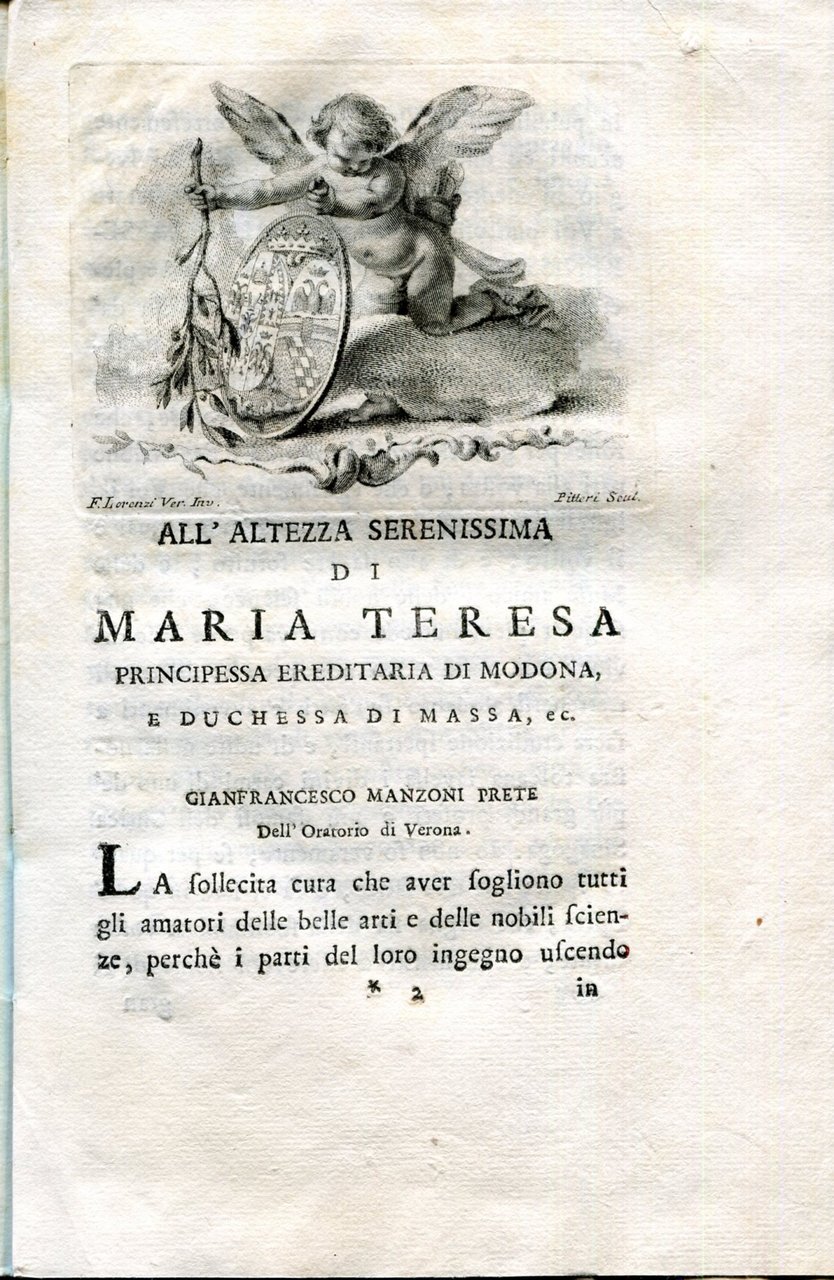 In 8, pp. 179. Legatura coeva cartoncino muto. Vignetta sul frontespizio e testatine calcogr. di Pitteri su disegno di F. Lorenzi. Il nome dell'autore, Gianfrancesco Manzoni prete, si ricava dalla dedica. Rare fioriture alle prime carte. Interno molto fresco Buono (Good) .
