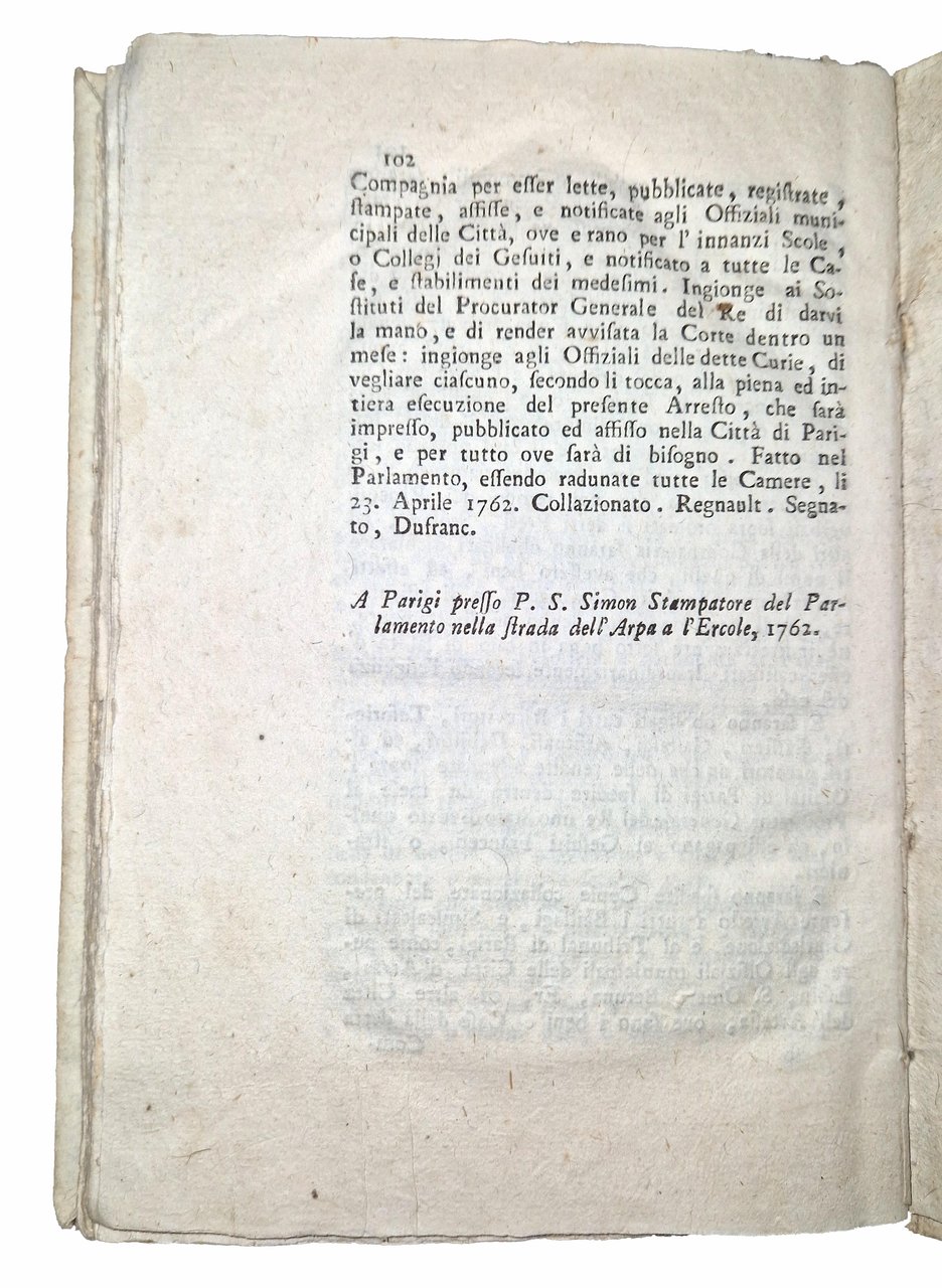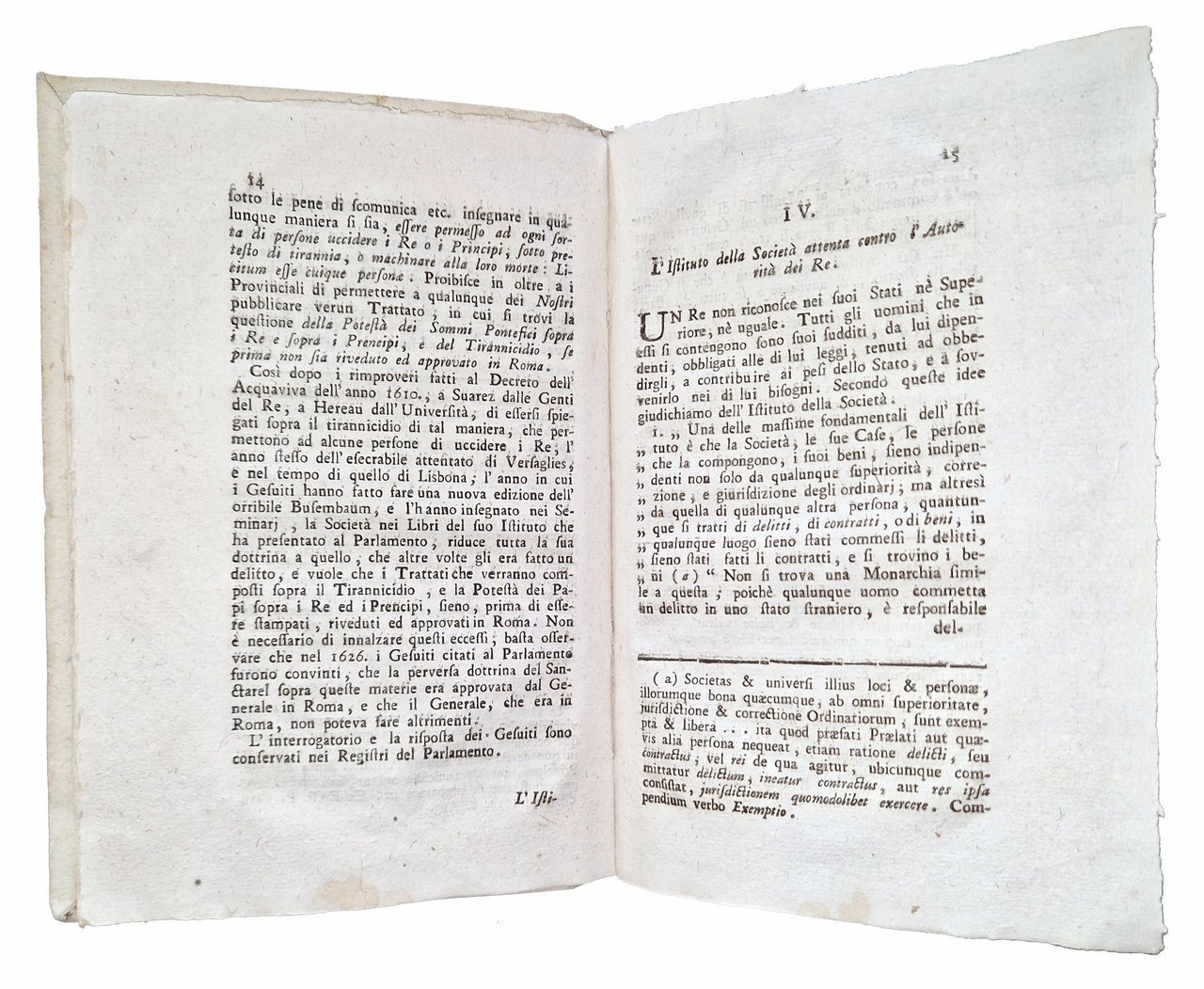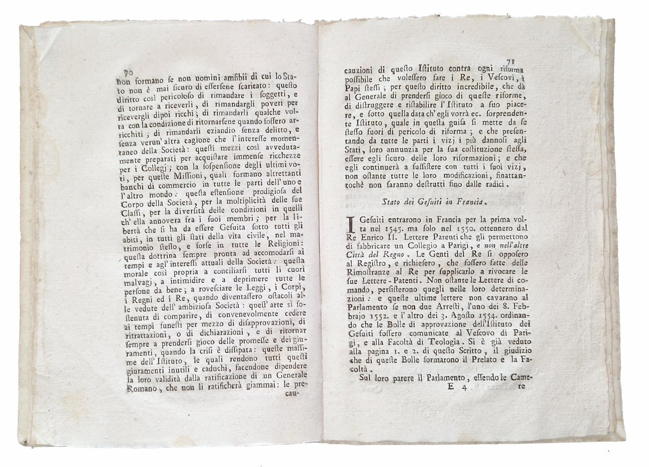 in-4°, 174x120 mm, leg. coeva in cartonato grezzo muto; pp. 102. Fregio xilografico al frontespizio, Prima ed unica edizione di questa disamina critica dell'Istituto dei Gesuiti, esposta da Christophe Coudrette (1701-1774), colto pubblicista francese, prima sacerdote Gesuita, poi divenuto consigliere del Parlamento di Parigi, forte oppositore e critico dell'Istituto dei Gesuiti. Rif.: IT\ICCU\LIGE\004214. OCLC, 955050543. Cond.: Rare fioriture. Esemplare quasi in ottime condizioni.