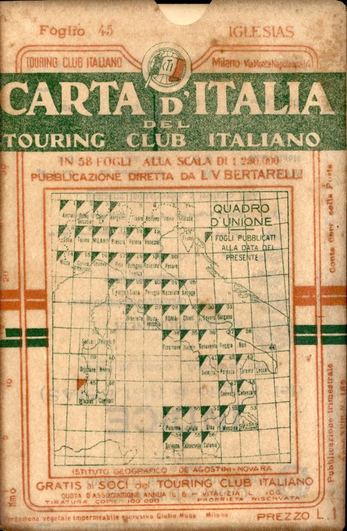 Foglio 45 - Iglesias. Con custodia originale in pergamena vegetale. Allegato fascicolo con indice delle località contenute nella carta e legenda dei segni convenzionali. Stampa a colori. Scala 1:250.000. 914.5 - Ba Ottimo (Fine)