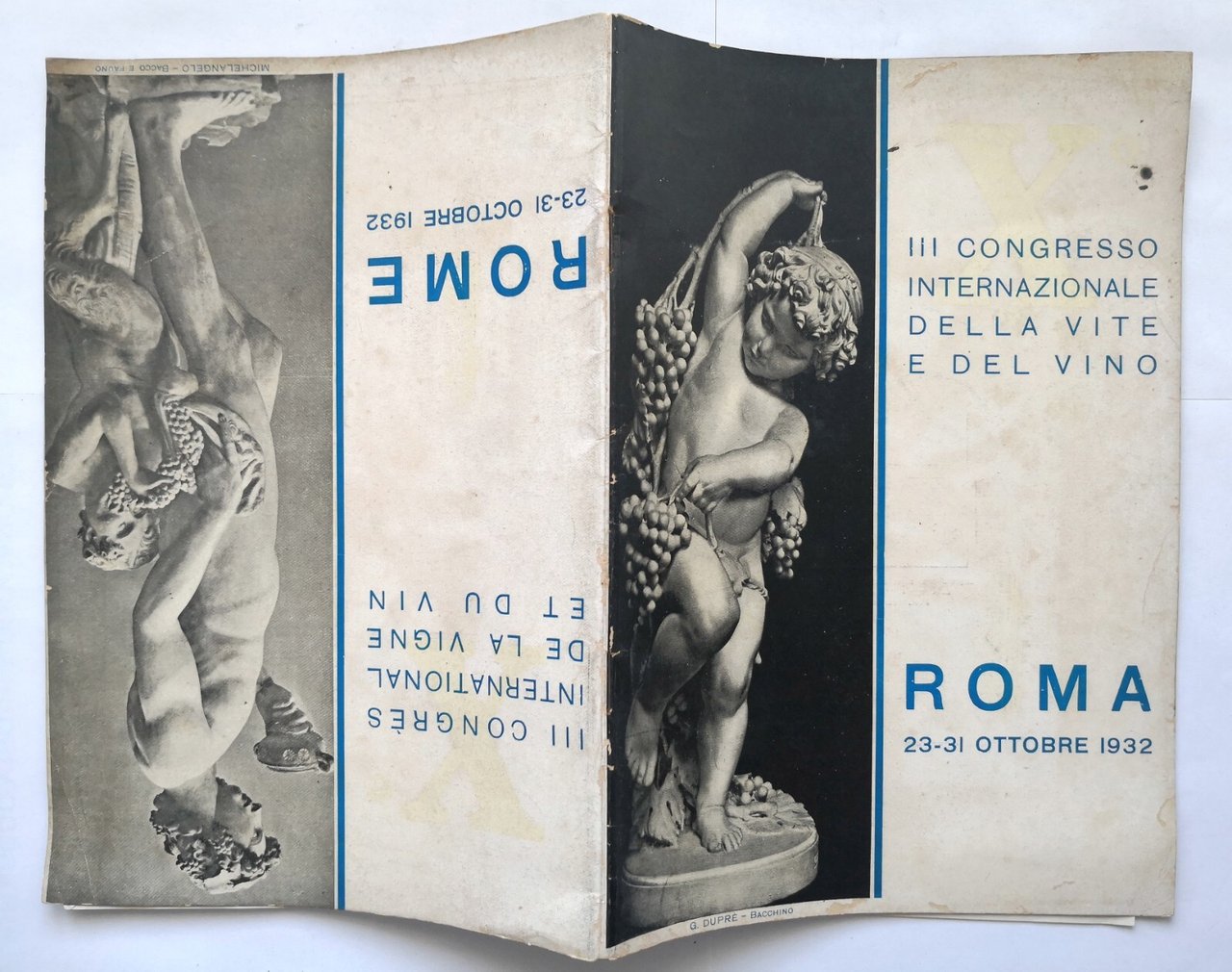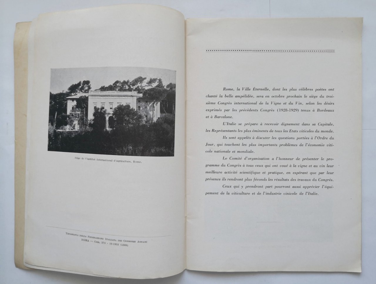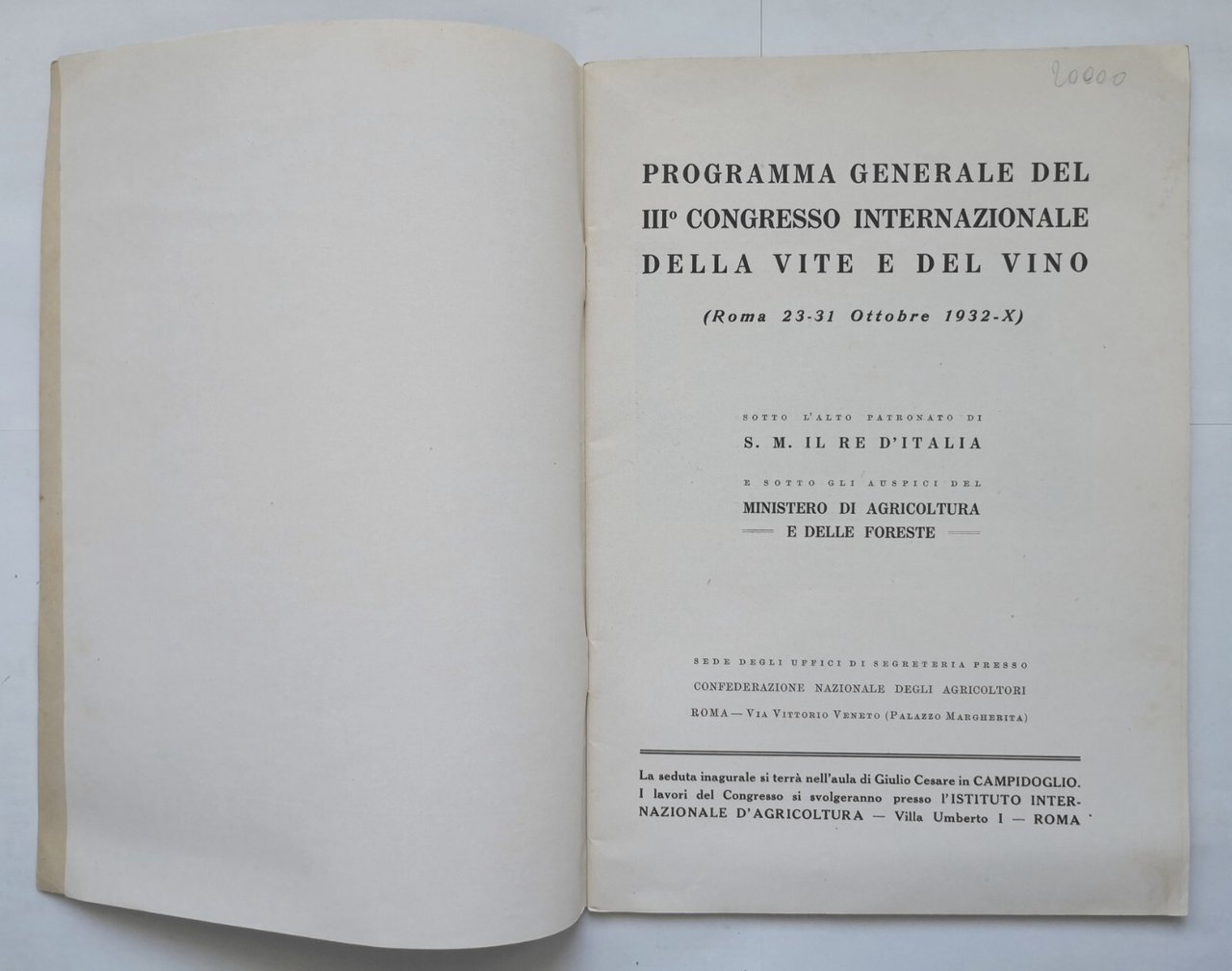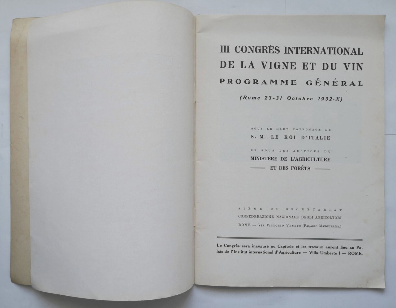 Programma Generale del III CONGRESSO INTERNAZIONALE DELLA VITE E DEL VINO (Roma 23-31 Ottobre 1932-X). Sotto l'alto patronato di S.M. Il Re d'Italia e sotto gli auspici del Ministero di Agricoltura e delle foreste.