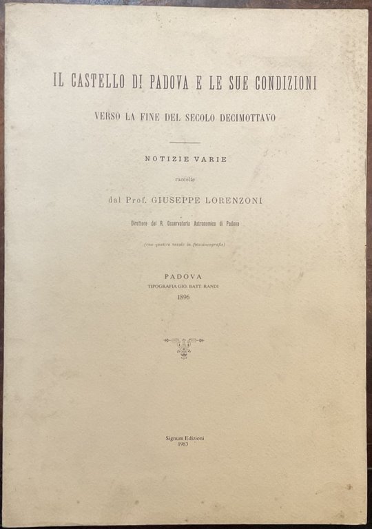 Ristampa anastatica dell'ediz. originale (Padova, Tip. Gio. Batt. Randi, 1896). Molto buono, bross., in-4, 30 pp, 4 ill. bn ft, macchie in cop.