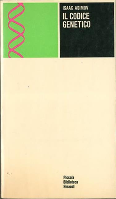 200 p. ; 18 x 11 cm. Piccola biblioteca Einaudi, 100. "Il codice genetico" è un'introduzione al DNA e all'RNA di Isaac Asimov. La più importante scoperta scientifica dei tempi moderni avvenne nel 1944 quando O.T. Avery e due colleghi scoprirono il DNA. Questa misteriosa sostanza è la base di tutta la vita sulla terra. Il DNA determina la natura di ogni organismo vivente, dall'ameba all'uomo. In "Il codice genetico" Isaac Asimov ripercorre, passo dopo passo, la ricerca scientifica che ha portato a questa grande conquista. Analizza il suo significato e le sue conseguenze e, in un'affascinante previsione, ipotizza come questa nuova conoscenza genetica possa essere usata per controllare lo sviluppo fisico e mentale di una futura razza di uomini. Titolo originale dell'opera: "The Genetic code". Traduzione di Fiamma Bianchi Bandinelli Baranelli . Brossura editoriale, coperta in cartoncino flessibile colorato (b/n e verde), titolo al piatto e al dorso. Codice libreria 7871.