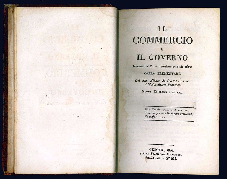 Il commercio e il governo considerati l'uno relativamente all'altro. Opera elementare del Sig. Abbate di Condillac dell'Accademia Francese. Nuova edizione italiana.