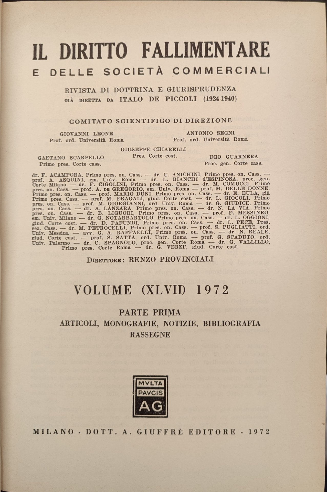 Il diritto fallimentare e delle società commerciali. Rivista di dottrina e giurisprudenza già diretta da Italo De Piccoli. Volume (XLVII) 1972