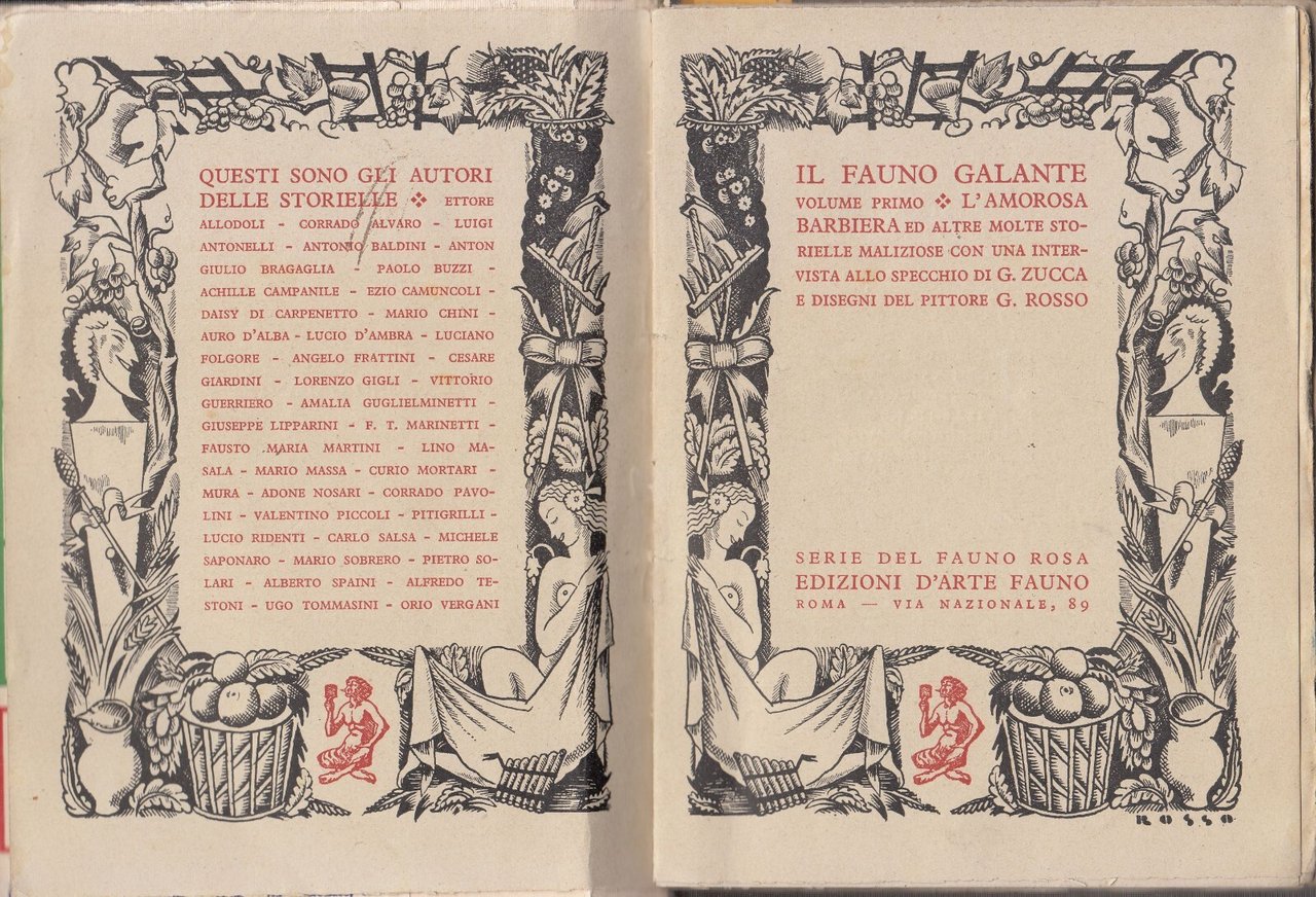 IL FAUNO GALANTE. Volume primo L'amorosa Barbiera ed altre molte storielle maliziose, con una intervista allo specchio di G. Zucca e disegni del pittore G. Rosso. Racconti, tra gli altri, di: Filippo Tommaso Marinetti, Orio Vergani, Lucio D'Ambra, Corrado Alvaro, Amalia Guglielminetti, Achille Campanile, Anton Giulio Bragaglia, Mura.