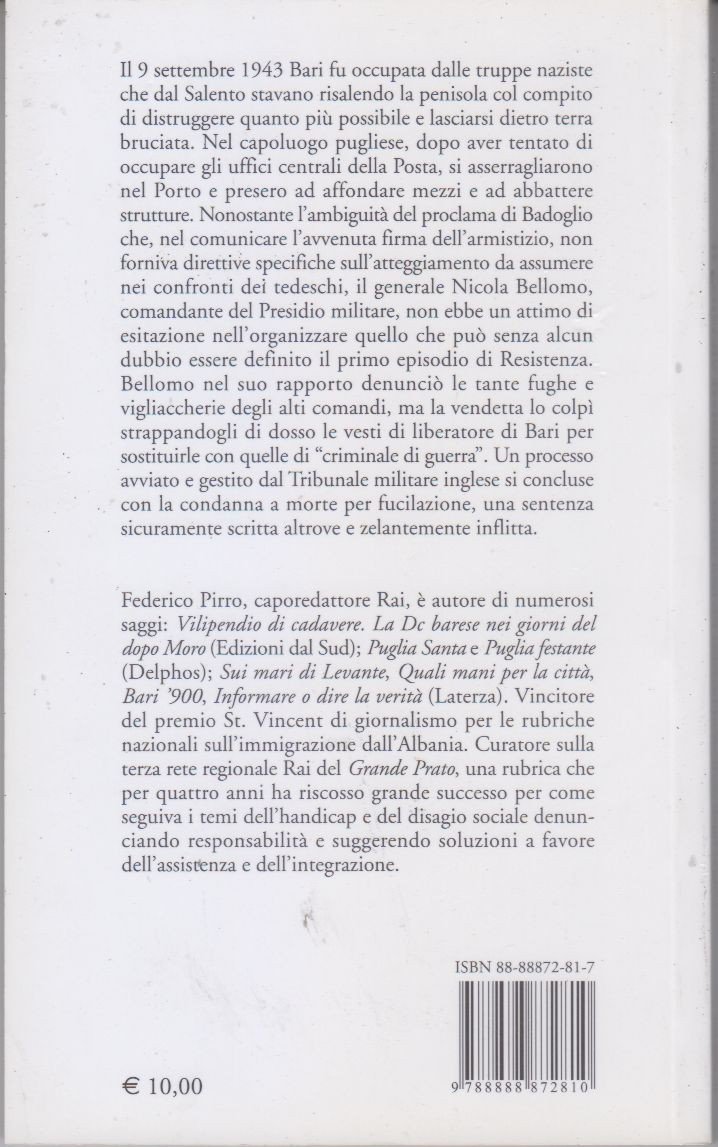 IL GENERALE BELLOMO di Federico Pirro 2004 Palomar Libro liberò Bari fu fucilato