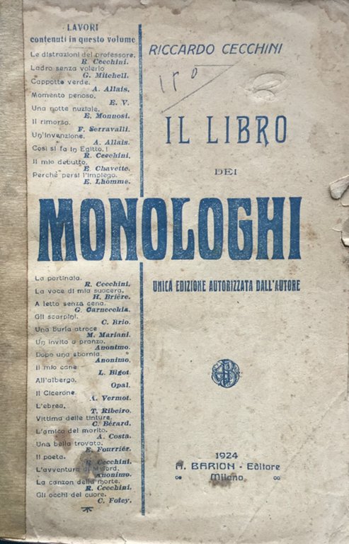 Milano, Barion, 1924, in 16mo. Broassura editoriale, 188 pp. 853 - V In Sedicesimi (10-17cm ) Mediocre (Poor) Accettabile