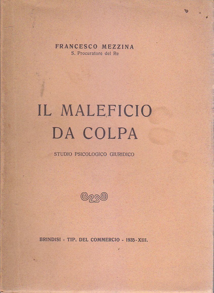 IL MALEFICIO DA COLPA studio psicologico giuridico di Francesco Mezzina. Brindisi, Tipografia del Commercio 1935. 158 Pagine. Copertina editoriale in brossura. Stato di conservazione: molto