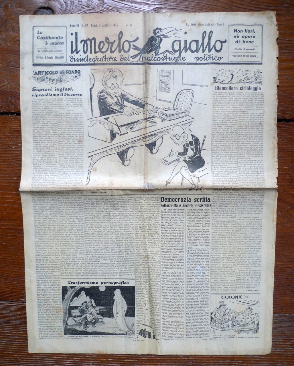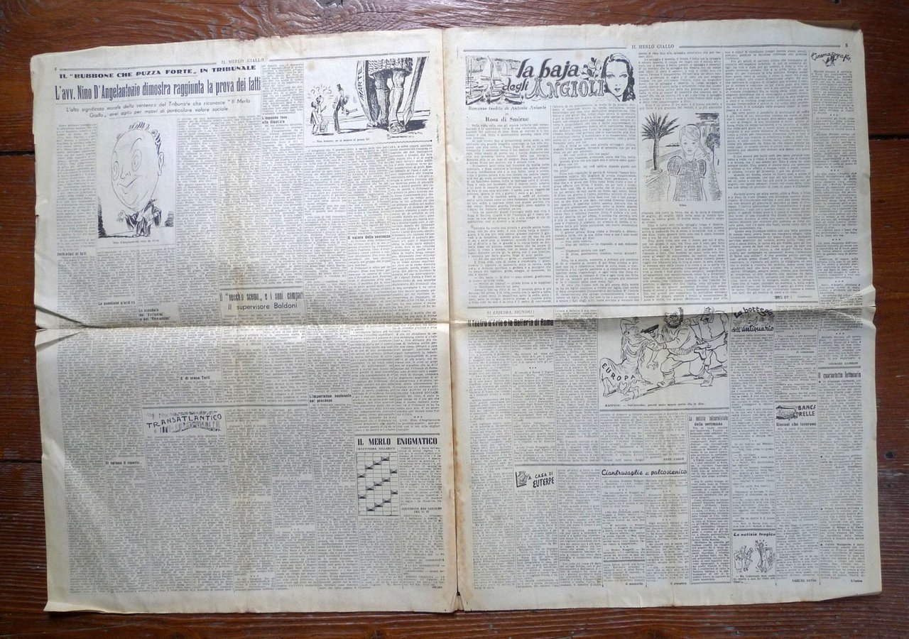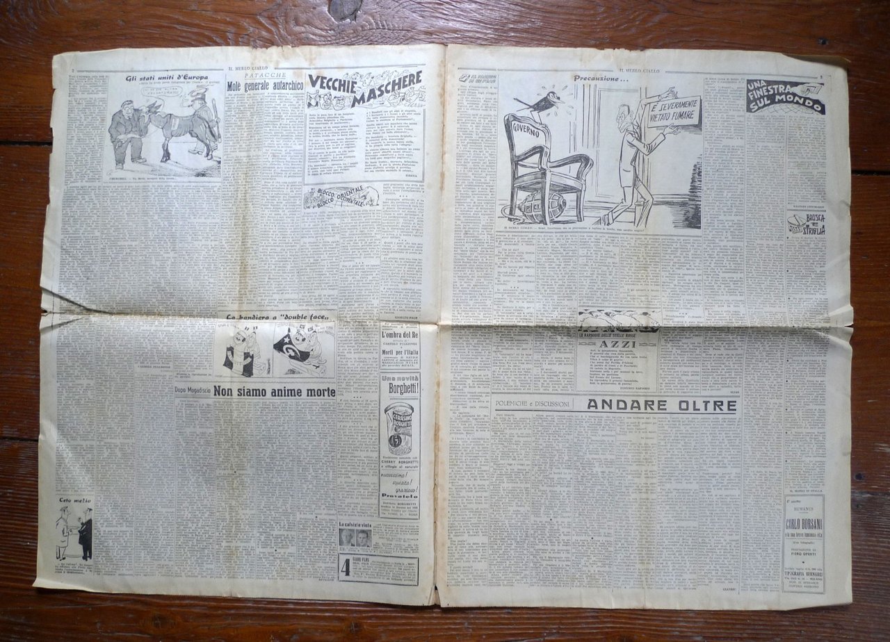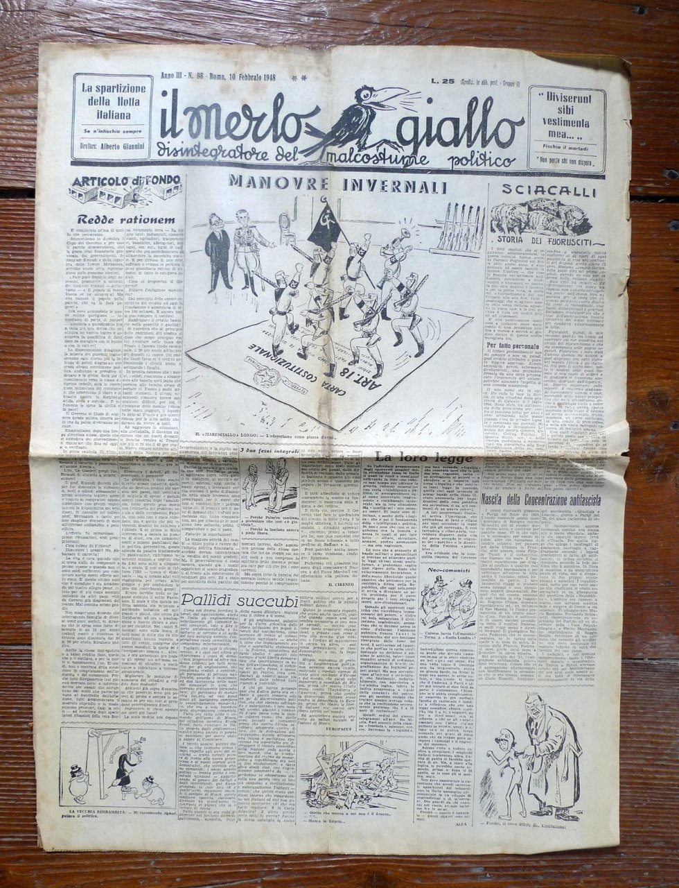 [Lotto di 38 numeri]IL MERLO GIALLO.DISINTEGRATORE DEL MALCOSTUME POLITICO.Settimanale.Direttore: Alberto Giannini.Roma 1948-1949,57,5x42 cm., pp.6,illustrazioni in bianco e nero,peso: kg.3cod.100112CONDIZIONI DEL PERIODICO: discrete,piega centrale,pagine ingiallite e fioriture,strappetti ai margini delle pagine,tutti protetti da busta di plasticaNUMERI COMPRESI NEL LOTTO:Anno III n.97 3 Febbraio 1948Anno III n.98 10 Febbraio 1948Anno III n.100 24 Febbraio 1948Anno III n.103 16 Marzo 1948Anno III n.104 30 Marzo 1948Anno III n.106 13 Aprile 1948Anno III n.107 20 Aprile 1948Anno III n.108 27 Aprile 1948Anno III n.109 4 Maggio 1948Anno III n.110 10 Maggio 1948Anno III n.111 18 Maggio 1948Anno III n.112 25 Maggio 1948Anno III n.114 8 Giugno 1948Anno III n.115 15 Giugno 1948Anno III n.116 22 Giugno 1948Anno III n.117 29 Giugno 1948Anno III n.118 6 Luglio 1948Anno III n.120 20 Luglio 1948Anno III n.121 27 Luglio 1948Anno III n.122 3 Agosto 1948Anno III n.123 10 Agosto 1948Anno III n.124 17 Agosto 1948Anno III n.125 24 Agosto 1948Anno III n.126 31 Agosto 1948Anno III n.127 7 Settembre 1948Anno III n.128 14 Settembre 1948Anno III n.129 21 Settembre 1948Anno III n.130 28 Settembre 1948Anno III n.131 5 Ottobre 1948Anno III n.132 12 Ottobre 1948Anno III n.133 19 Ottobre 1948Anno III n.134 26 Ottobre 1948Anno III n.135 2 Novembre 1948Anno III n.136 9 Novembre 1948Anno III n.139 30 Novembre 1948Anno III n.140 7 Dicembre 1948Anno III n.141 14 Dicembre 1948Anno IV n.144 4 Gennaio 1949
