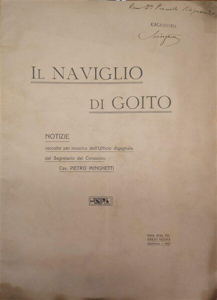 in folio, pp. 24, (2), bross. edit. Con 2 lunghe tavv. a colori più volte ripiegate al fine raff. il naviglio e suoi canali con le indicazioni in legenda delle bocche dei sostegni, degli opifici e manufatti, la seconda riproduce un cabreo del 1703 conservato all'Archivio Storico Gonzaga redatto da Doriciglio Moscatelli Battaglia. Invio autogr. dell'A. Raro. Traccia di piegatura centrale. Ottimo esempl. [055]
