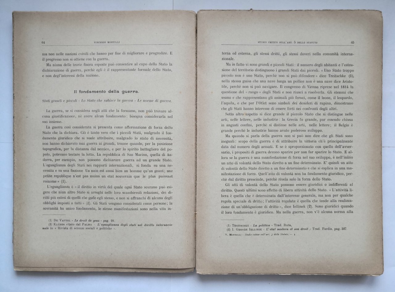 STUDIO CRITICO SULL'ARTICOLO 5 DELLO STATUTO per gl'incisi "Il Re dichiara la guerra, fa i trattati" e di diritto comparato relativo di Vincenzo Montulli.