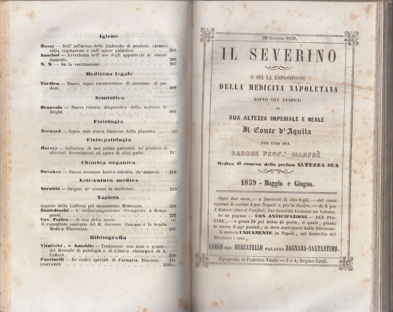 IL SEVERINO o sia la esposizione della medicina napoletana sotto gli auspicii di sua altezza il conte d'Aquila per cura del Barone Professor Manfrè. 1859 Annata Completa.