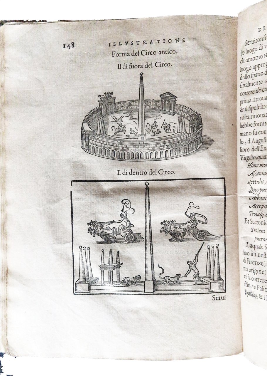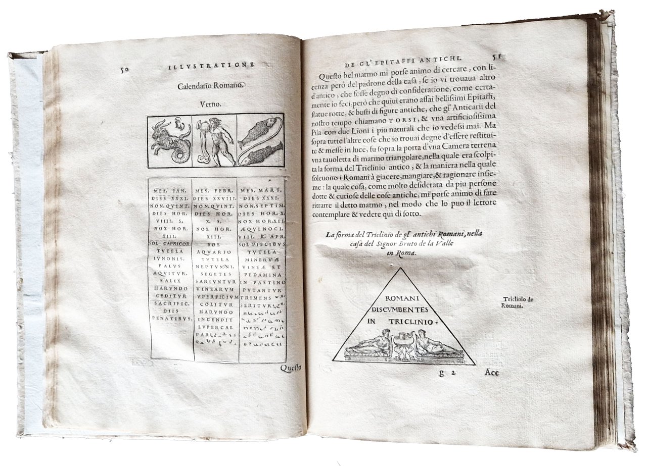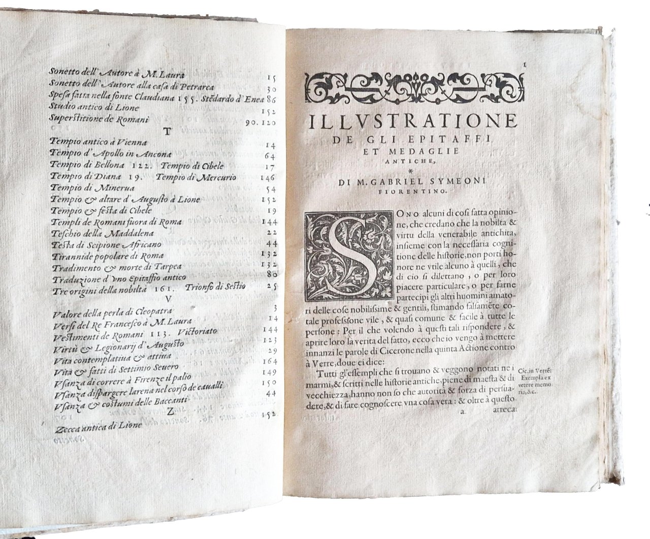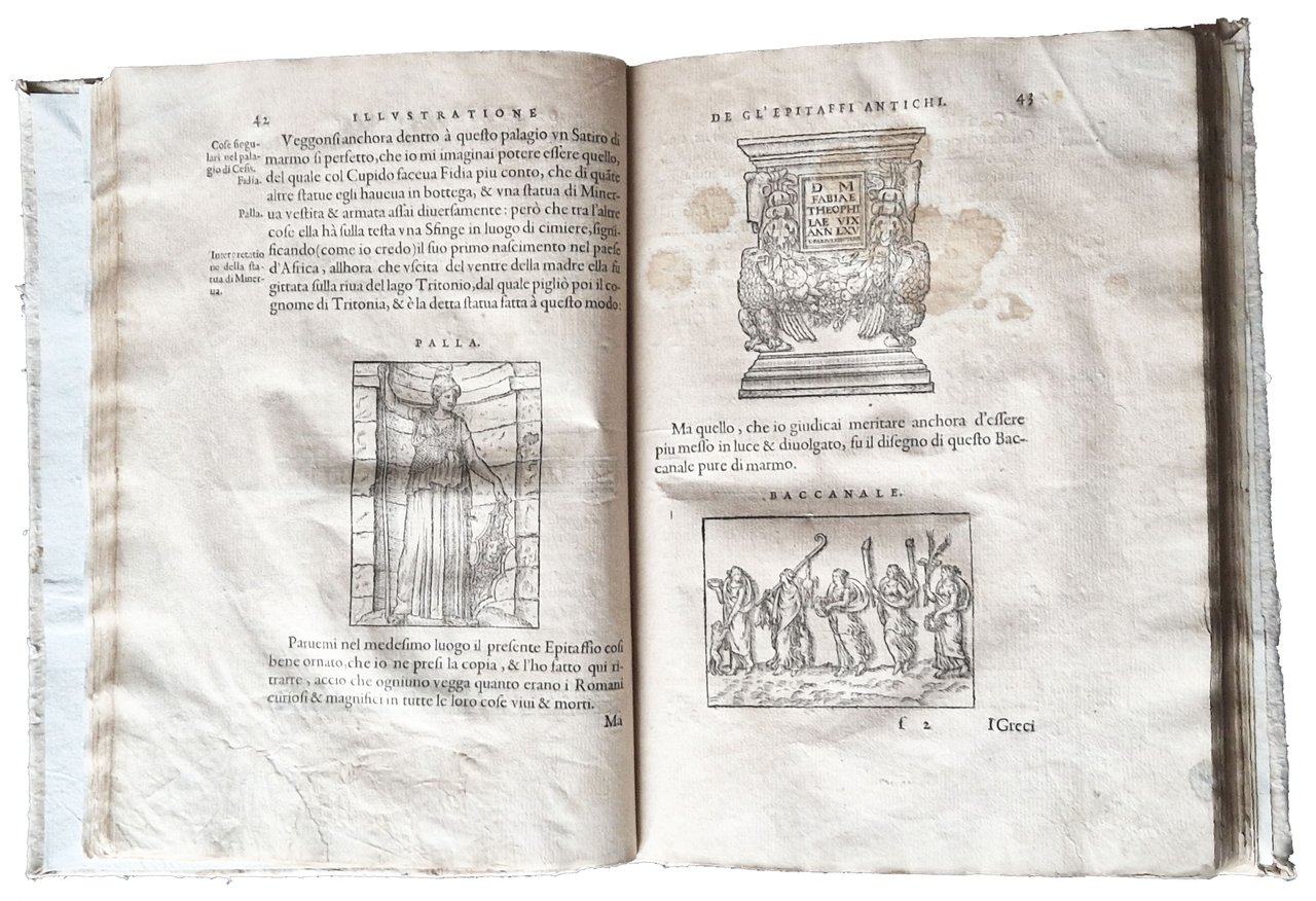 in-4°, 218x156 mm, leg. moderna in cartonato grezzo; pp. [16], 174, [2]. Numerose illustrazioni xilografiche nel testo. Testatine, iniziali e fregi xilografici; ritratto dell'A. sul verso del frontespizio; motto in cornice sul frontespizio. L'opera è riccamente illustrata con incisioni xilografiche; in particolare con un frontespizio architettonico, un ritratto dell'autore e 68 figure (17 in più rispetto all'edizione francese). Molte figure sono attribuite a Bernard Salomon; da notare i 12 bellissimi legni che raffigurano i dodici segni zodiacali. Prima edizione di questo testo pubblicato lo stesso anno in francese (col tit.: Les illustres obseruations antiques) da Gabriele Simeoni (1509-1576?), letterato fiorentino, filosofo, poeta, storico, astrologo e traduttore di latino (Ovidio) e dal francese. Quest'opera è considerata una delle edizioni più belle stampate da Jean de Tournes. Prov.: Antica iscrizione d'appartenenza manoscritta al frontespizio (ex libris Thomas di Castello?). Rif.: IT\ICCU\BVEE\003243. CNCE 35000. OCLC, 1403635001. Cond.: Legatura moderna in ottime condizioni. Carte abbastanza pulite con occasionali fioriture e bruniture. Presenza di forellini di tarlo su alcune carte (dalla p. 115 alla p. 160) in corrispondenza del bordo interno, vicino alla legatura, senza alcuna perdita di testo/incisioni. Esemplare nel complesso molto buono.