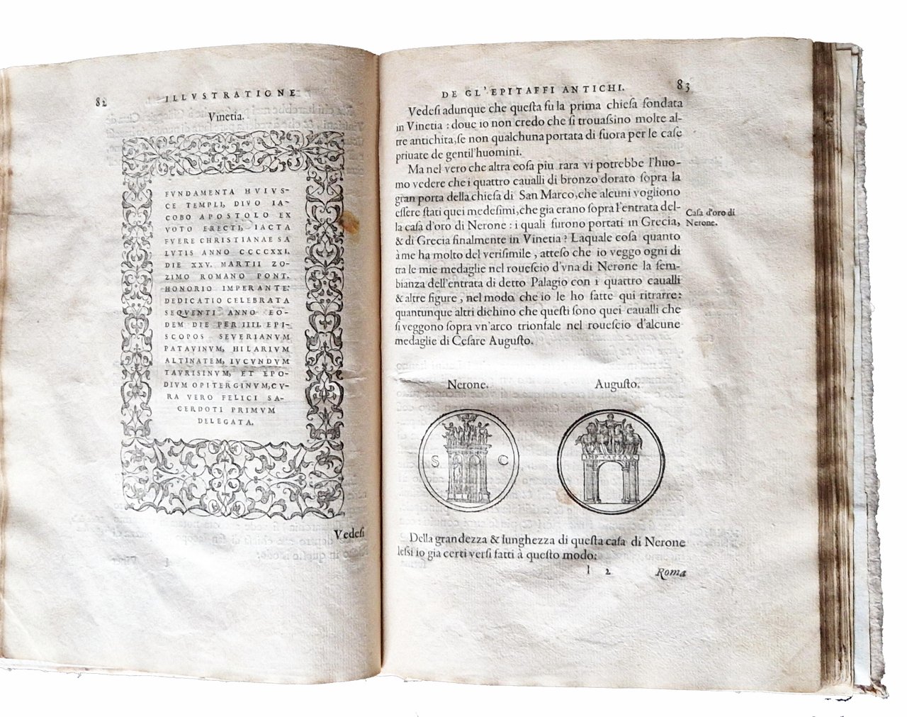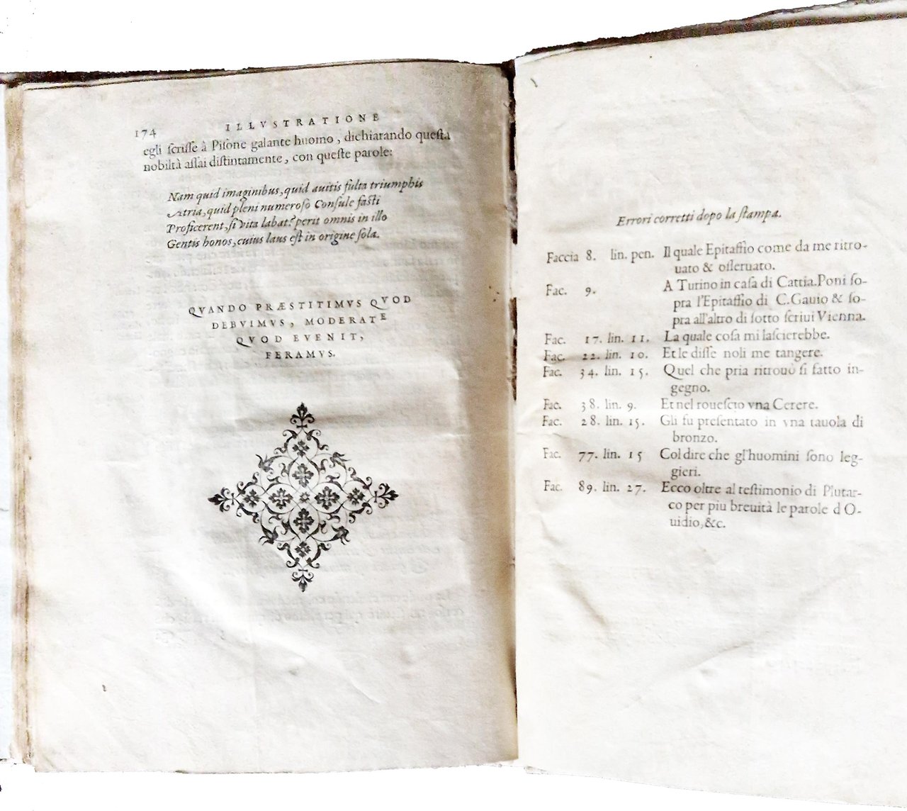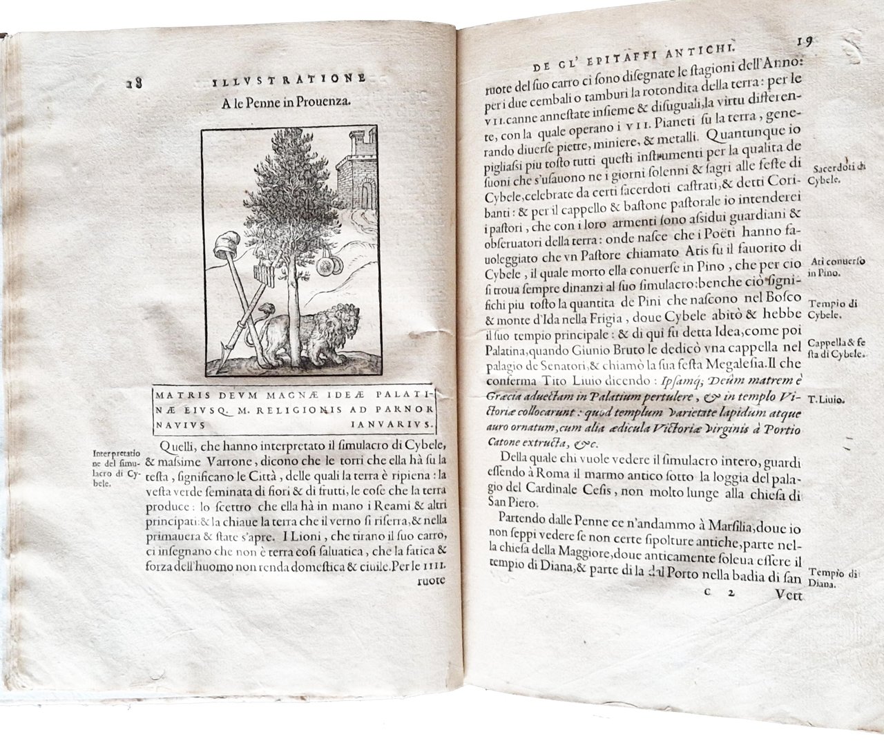 in-4°, 218x156 mm, leg. moderna in cartonato grezzo; pp. [16], 174, [2]. Numerose illustrazioni xilografiche nel testo. Testatine, iniziali e fregi xilografici; ritratto dell'A. sul verso del frontespizio; motto in cornice sul frontespizio. L'opera è riccamente illustrata con incisioni xilografiche; in particolare con un frontespizio architettonico, un ritratto dell'autore e 68 figure (17 in più rispetto all'edizione francese). Molte figure sono attribuite a Bernard Salomon; da notare i 12 bellissimi legni che raffigurano i dodici segni zodiacali. Prima edizione di questo testo pubblicato lo stesso anno in francese (col tit.: Les illustres obseruations antiques) da Gabriele Simeoni (1509-1576?), letterato fiorentino, filosofo, poeta, storico, astrologo e traduttore di latino (Ovidio) e dal francese. Quest'opera è considerata una delle edizioni più belle stampate da Jean de Tournes. Prov.: Antica iscrizione d'appartenenza manoscritta al frontespizio (ex libris Thomas di Castello?). Rif.: IT\ICCU\BVEE\003243. CNCE 35000. OCLC, 1403635001. Cond.: Legatura moderna in ottime condizioni. Carte abbastanza pulite con occasionali fioriture e bruniture. Presenza di forellini di tarlo su alcune carte (dalla p. 115 alla p. 160) in corrispondenza del bordo interno, vicino alla legatura, senza alcuna perdita di testo/incisioni. Esemplare nel complesso molto buono.