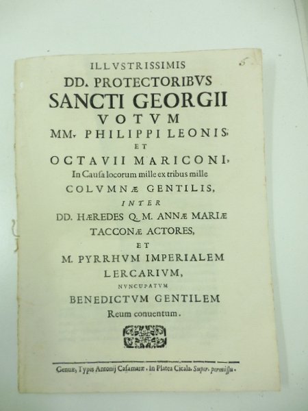 Illustrissimis dd. protectoribus Sancti Georgii votum MM. Philippi Leonis et Octavii Mariconi in causa locorum mille ex tribus mille Columnae Gentilis inter DD. haeredes Q. M. Annae mariae tacconae actores et M. Pyrrhum Imperialem Lercarium nuncupatum Benedictum Gentilem reum conventum