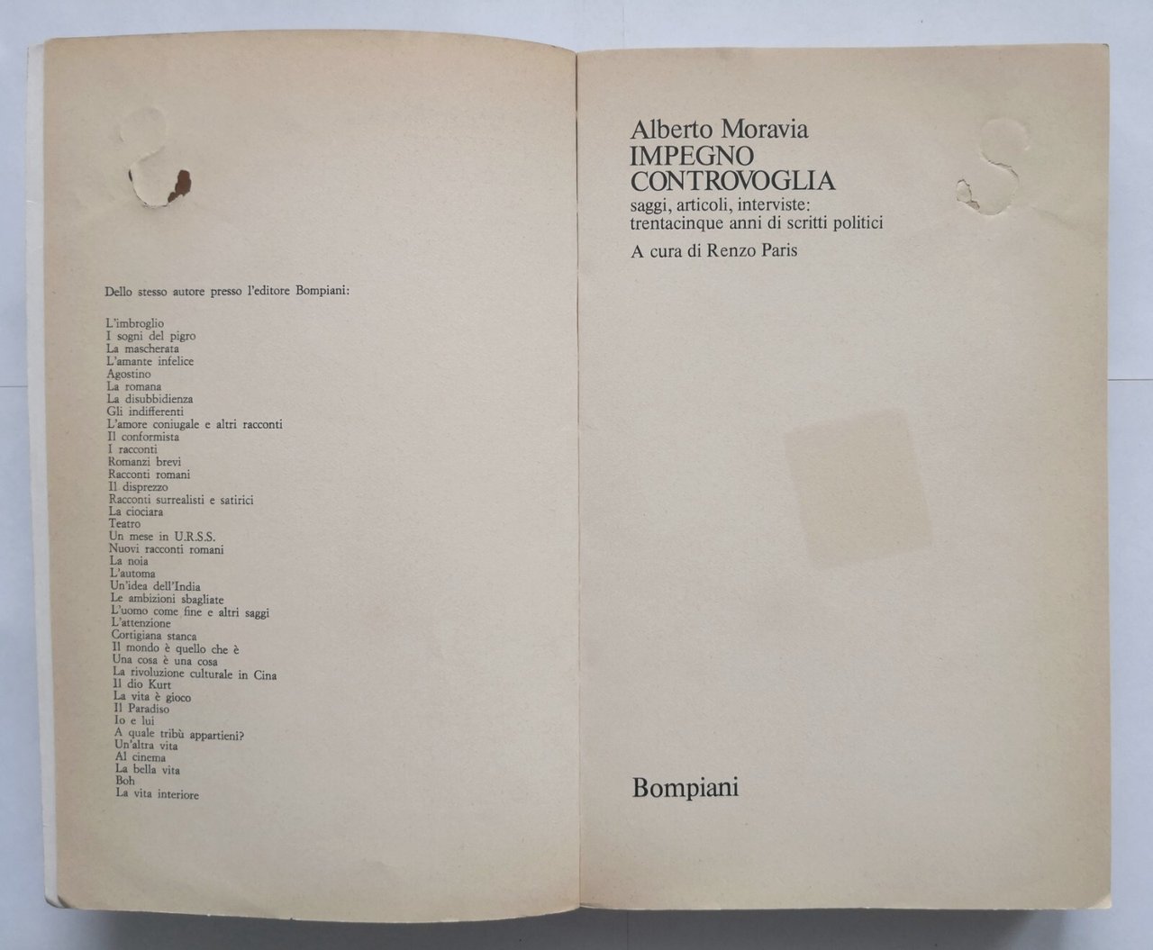IMPEGNO CONTROVOGLIA di Alberto Moravia a cura Renzo Paris 1980 Bompiani Libro