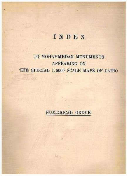 Index to Mohammed Monuments appearing on the special 1:5000 scale maps of Cairo. Numerical order-Chronological order-Alphabetical order.