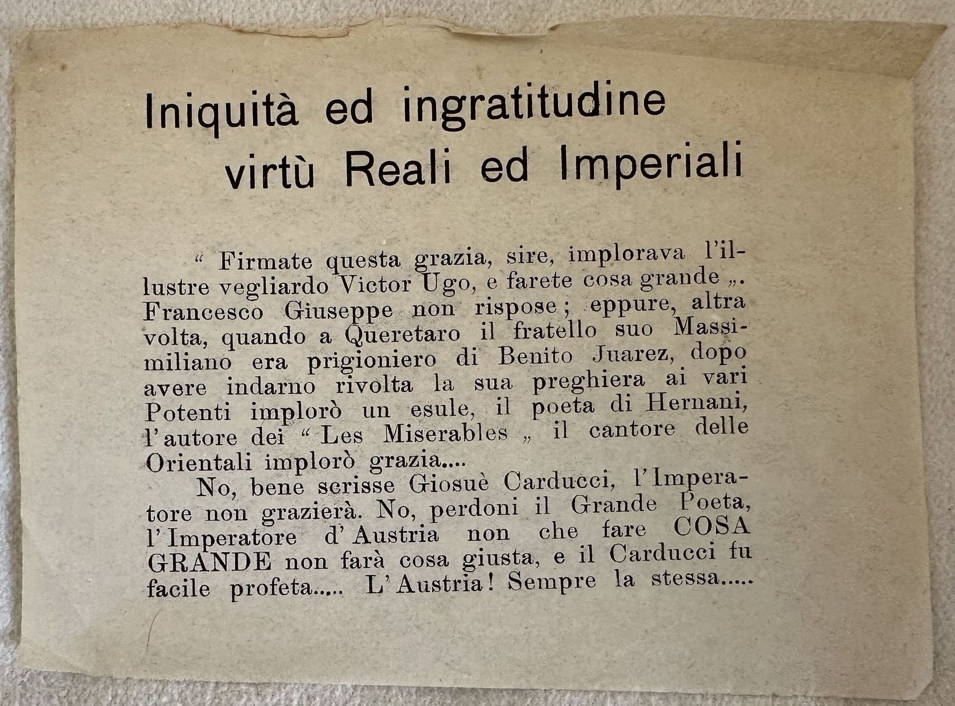 Rarissimo volantino contro il governo Austriaco che fa riferimento alla condanna a morte del martire triestino Guglielmo Oberdan. "Guglielmo Oberdank nacque a Trieste il 1° febbraio del 1858. Prese il cognome materno e non quello del padre naturale. Volle poi italianizzare questo cognome in Oberdan. Studente di ingegneria, quando l'Austria mobilitò per occupare la Bosnia (1878) fuggì a Roma. Qui cominciò una grande attività di propoganda a favore dell'unità nazionale. Nel 1882, sapendo che L'Imperatore Francesco Giuseppe si sarebbe recato a Trieste, organizzò un attentato ai danni di questi. Suo scopo era proprio quello di fornire se stesso come martire per la causa triestina. Fù arrestato prima di poter mettere in atto il suo piano a causa di alcune delazioni. Dopo estenuanti interrogatori fù condannato all'impiccagione nonostante non fosse riuscito a mettere in pratica il piano e nonostante gli appelli di grazia anche di personaggi come Victor Hugo e Carducci. Sentenza che fù eseguita il 20 dicembre del 1882. Le sue ultime parole mentre il boia gli applicava i ceppi furono " Viva L'Italia, Viva Trieste libera, Fuori lo straniero!"." Senza data ma del 1883 circa. In buone condizioni, piegature. In 16. cm 12,5x16.Very scarce pamphlet against the austrian government refeering to the death condamnation of the martyre from Trieste Guglielmo Oberdan. "Guglielmo Oberdank nacque a Trieste il 1° febbraio del 1858. Prese il cognome materno e non quello del padre naturale. Volle poi italianizzare questo cognome in Oberdan. Studente di ingegneria, quando l'Austria mobilitò per occupare la Bosnia (1878) fuggì a Roma. Qui cominciò una grande attività di propoganda a favore dell'unità nazionale. Nel 1882, sapendo che L'Imperatore Francesco Giuseppe si sarebbe recato a Trieste, organizzò un attentato ai danni di questi. Suo scopo era proprio quello di fornire se stesso come martire per la causa triestina. Fù arrestato prima di poter mettere in atto il suo piano a causa di alcune delazioni. Dopo estenuanti interrogatori fù condannato all'impiccagione nonostante non fosse riuscito a mettere in pratica il piano e nonostante gli appelli di grazia anche di personaggi come Victor Hugo e Carducci. Sentenza che fù eseguita il 20 dicembre del 1882. Le sue ultime parole mentre il boia gli applicava i ceppi furono " Viva L'Italia, Viva Trieste libera, Fuori lo straniero!"." Not dated but of 1883 circa. In good conditions, foldings. In 16. cm 12,5x16.
