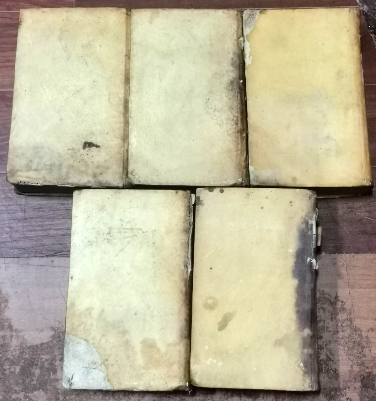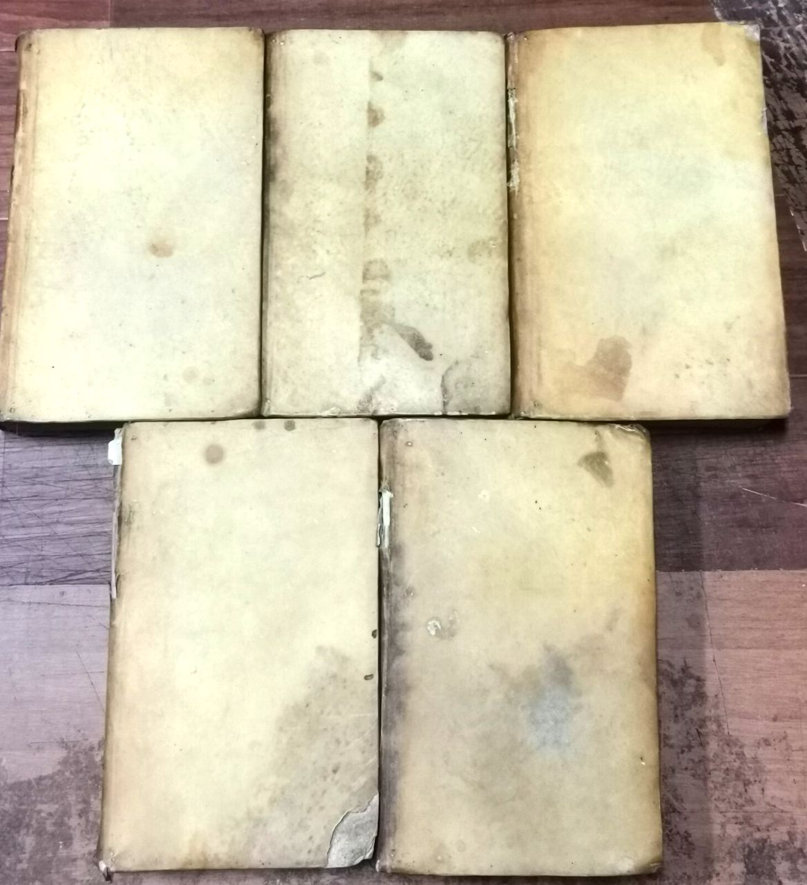Stato di conservazione: buono (firme di appartenenza datate 1854, fioriture e diverse gore d’umido che non inficiano minimamente la lettura, alcune piccole mancanze e macchie alle copertine, mancanze al dorso e agli angoli dei piatti del tomo III, legatura allentata al tomo III)