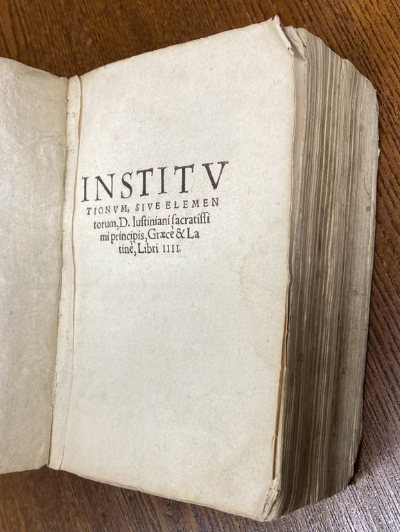 Iustiniani Augusti sacratissimi principis Institutionum libri IIII [Quoniam autem studiosis iuris est quoque Graece linguae utilis, cognitio, e regione latinis Theophili Graecam translationem.].
