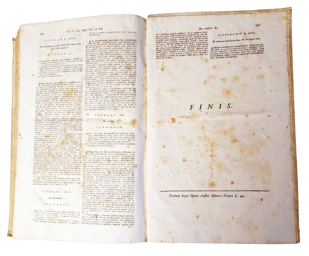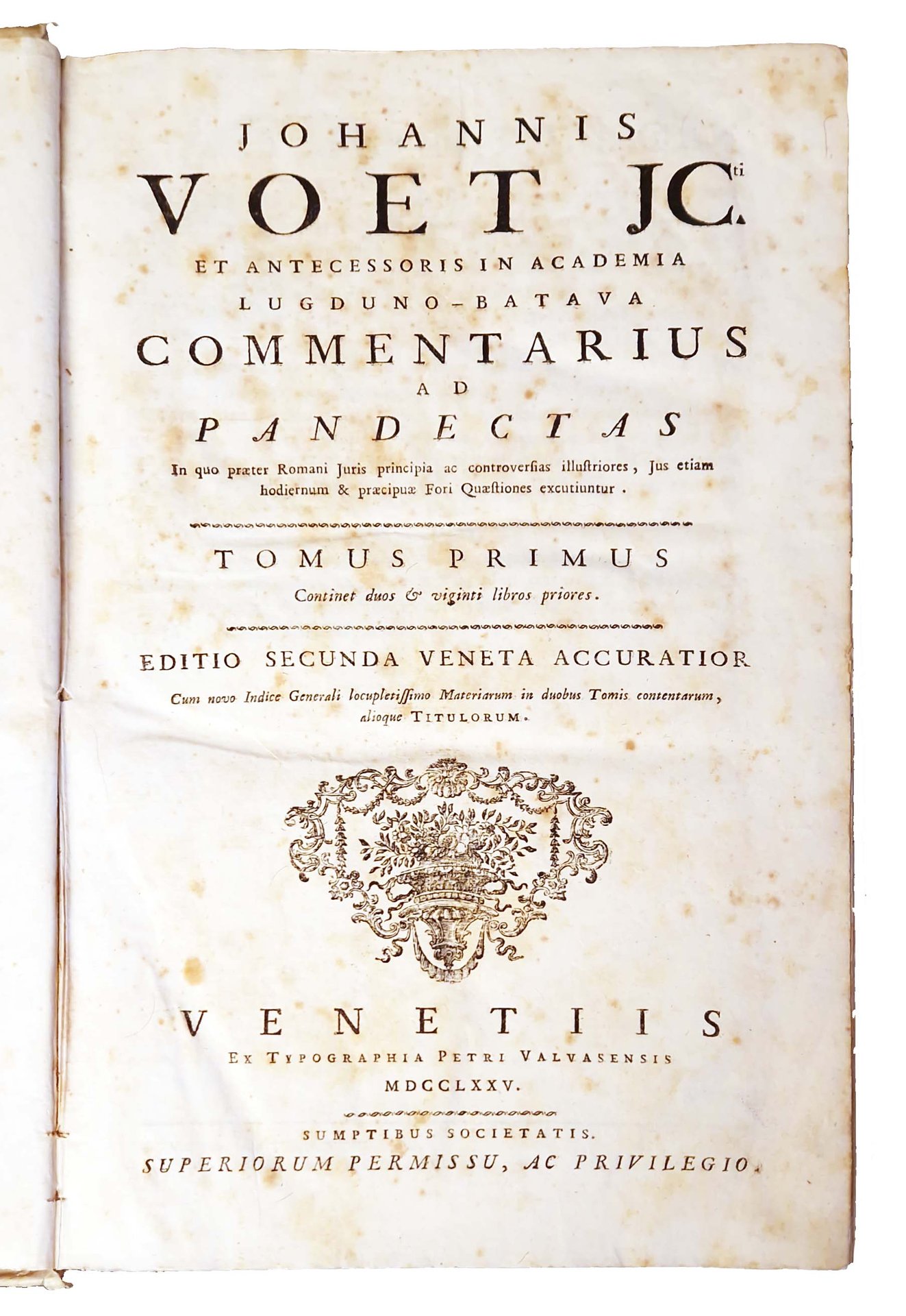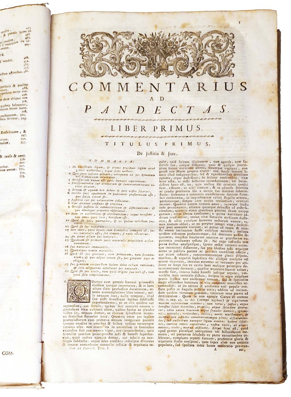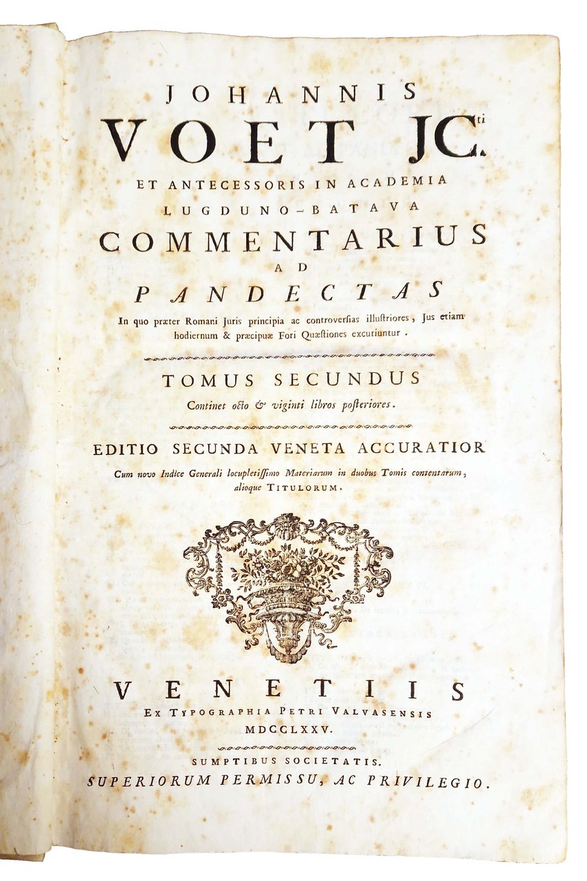 Johannis Voet JCti et Antecessoris in Academia Lugduno-Batava Commentarius ad pandectas in quo praeter Romani Juris principia ac controversias illustriores, Jus etiam hodiernum, et praecipuae Fori Quaestiones excutiuntur. Tomus primus [-secundus]. Editio secunda veneta accuratior cum novo indice generali locupletissimo materiarum in duobus tomis contentarum, alioque titulorum.