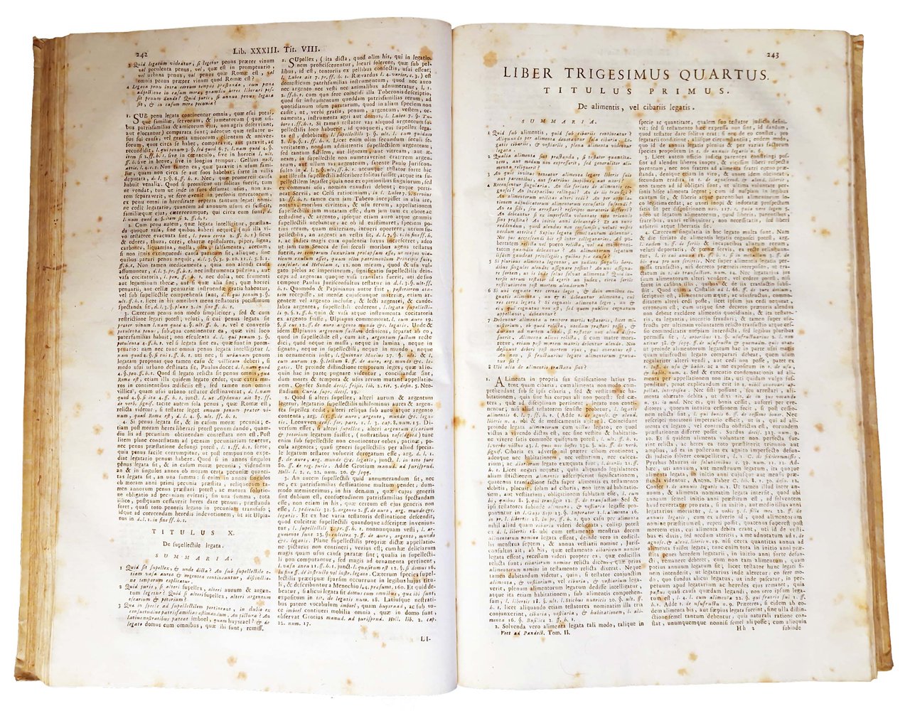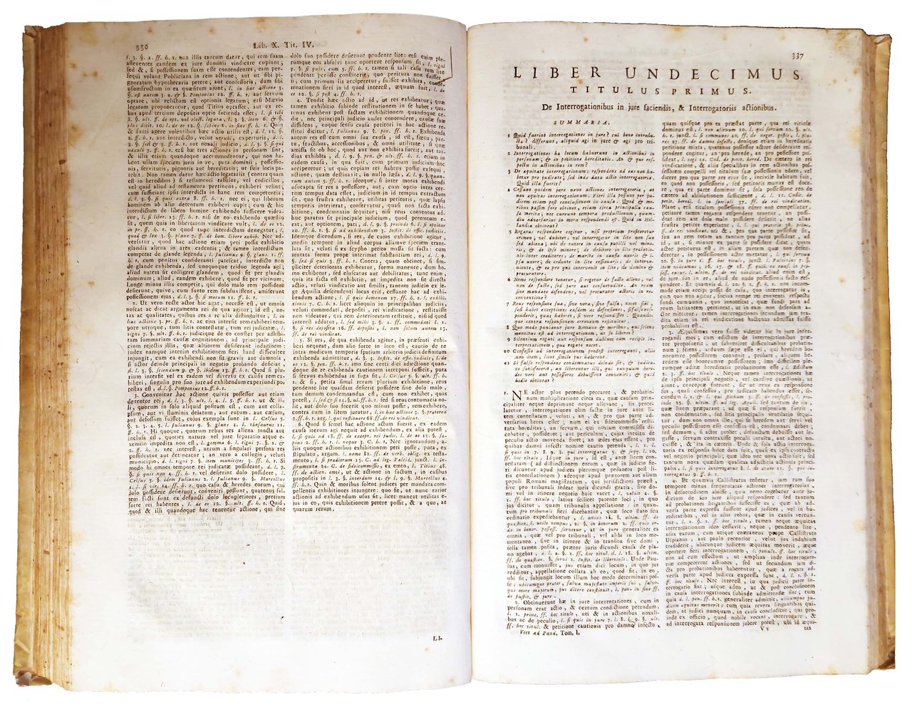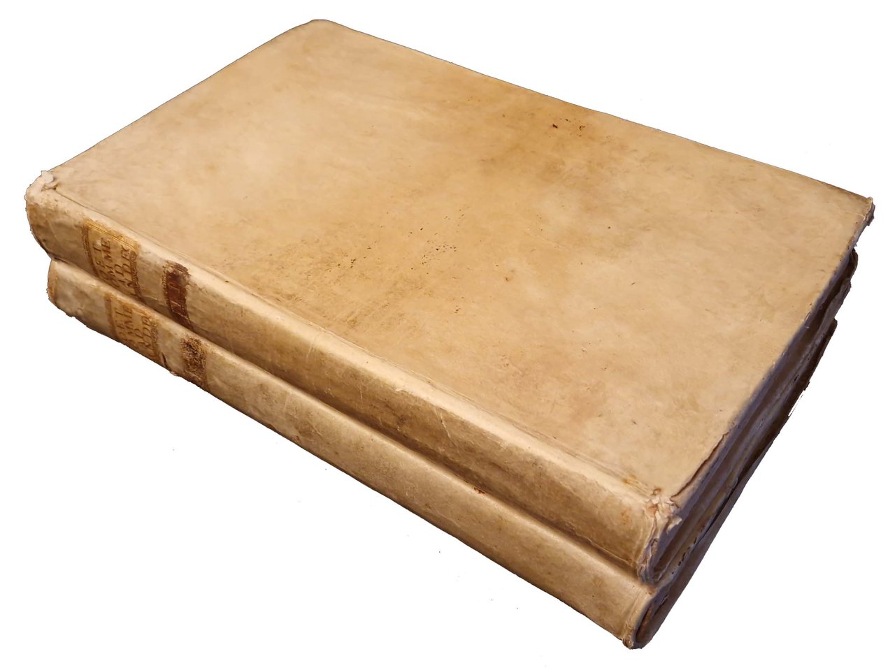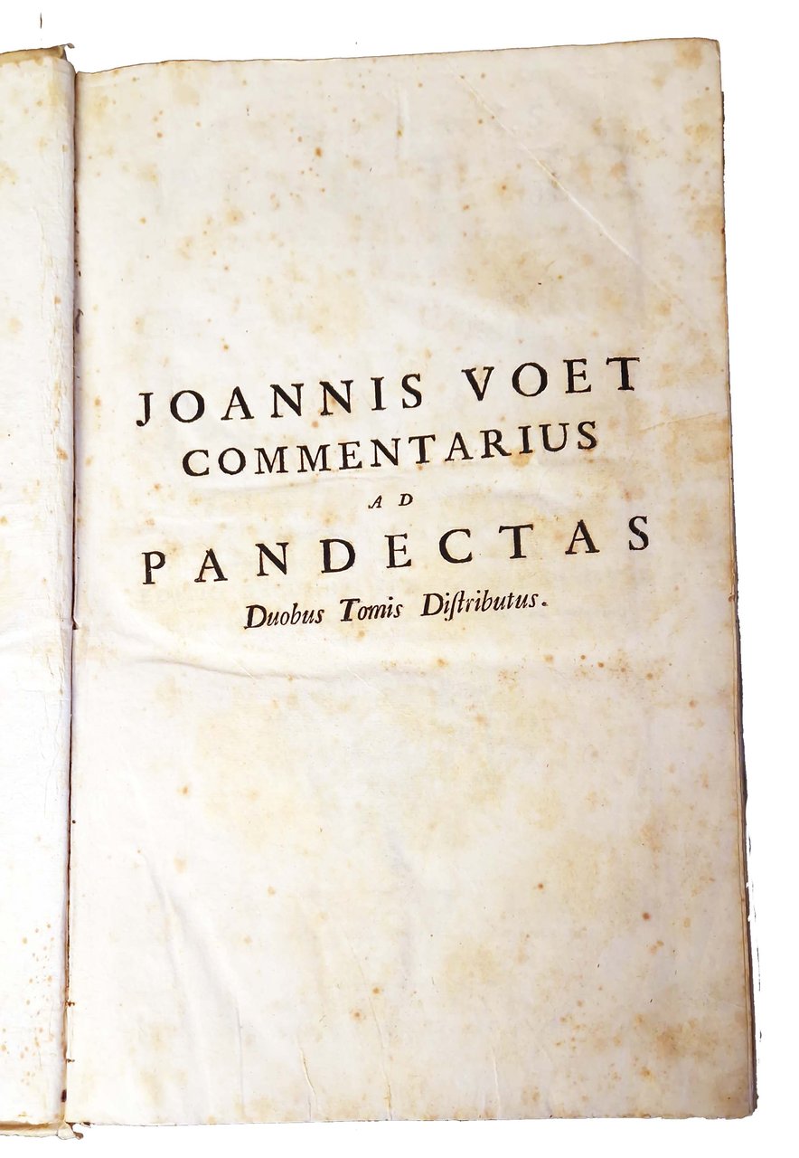 in-folio, 372x230 mm, leg. coeva in pergamena, con dorso liscio, titolo a caratteri dorati al dorso; opera in 2 tomi; pp. XVI, 680; VIII, 647, [1]. Vignette ai due frontespizi, testatine, capilettera e fregi xilografici. Seconda edizione veneta del commentario alle pandette a cura del giurista olandese Johannes Voet (1647-1713; insegnò diritto all'università di Utrecht dal 1673 e all'università di Leida dal 1680, esponente della scuola elegante olandese e del filone di analisi giuridica noto come Usus modernus Pandectarum, le sue opere furono di grande influenza sul panorama dottrinale italiano, francese e tedesco). Rif.: IT\ICCU\UBOE\003303. OCLC, 801039329. Cond.: Leggere tracce d'uso alla legatura (alcune macchie e abrasioni, piccoli strappi in corrispondenza delle cuffie, titoli sbiaditi). Carte abbastanza pulite, ma con presenza di fioriture e alcune macchie. Esemplari nel complesso in condizioni decisamente buone.