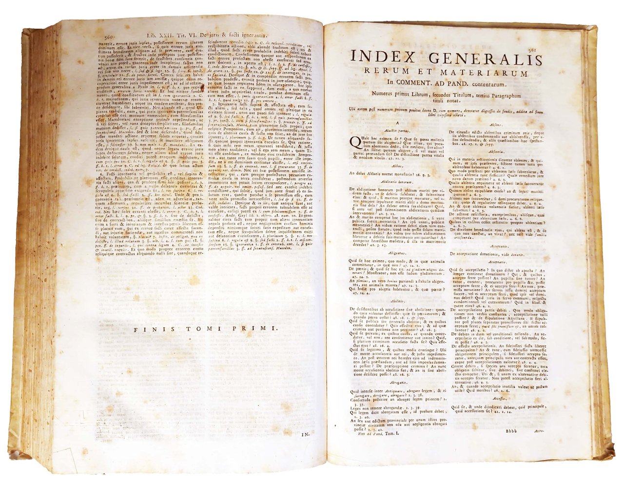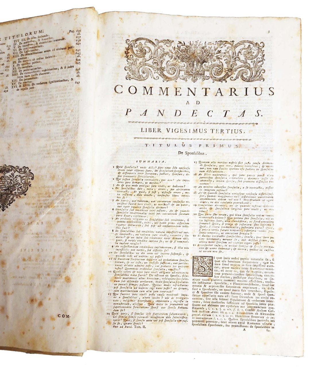 Johannis Voet JCti et Antecessoris in Academia Lugduno-Batava Commentarius ad pandectas in quo praeter Romani Juris principia ac controversias illustriores, Jus etiam hodiernum, et praecipuae Fori Quaestiones excutiuntur. Tomus primus [-secundus]. Editio secunda veneta accuratior cum novo indice generali locupletissimo materiarum in duobus tomis contentarum, alioque titulorum. | Livres anciens et modernes | Voet, Johannes